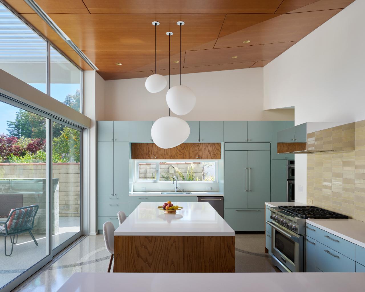 The kitchen opens onto the courtyard, and shares the same terrazzo floor design. Cabinets are plastic laminate on exposed-edge plywood, a long-lasting solution that will require little maintenance, and introduces a favorite color. Heath tile is used at the stove backsplash, with a custom high-polish hood that reflects light from the courtyard.