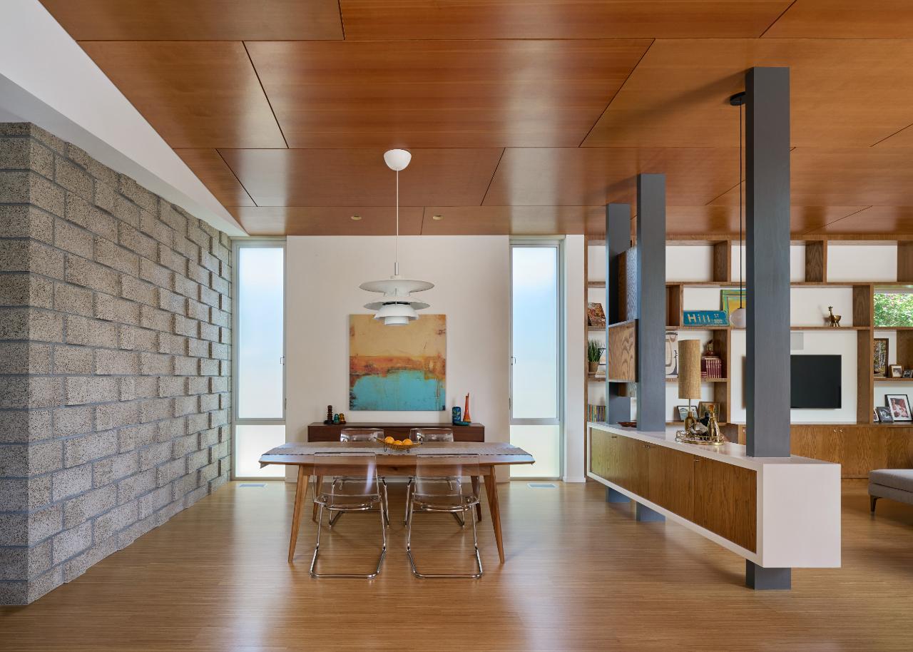 The dining and living spaces are separated by a floating cabinet, used to display some of the owner’s collectibles, as well as house the bar. A concrete block wall wraps the office, and continues to the exterior of the house, while the wood ceiling uses an over-scaled panel and connects the public spaces throughout.