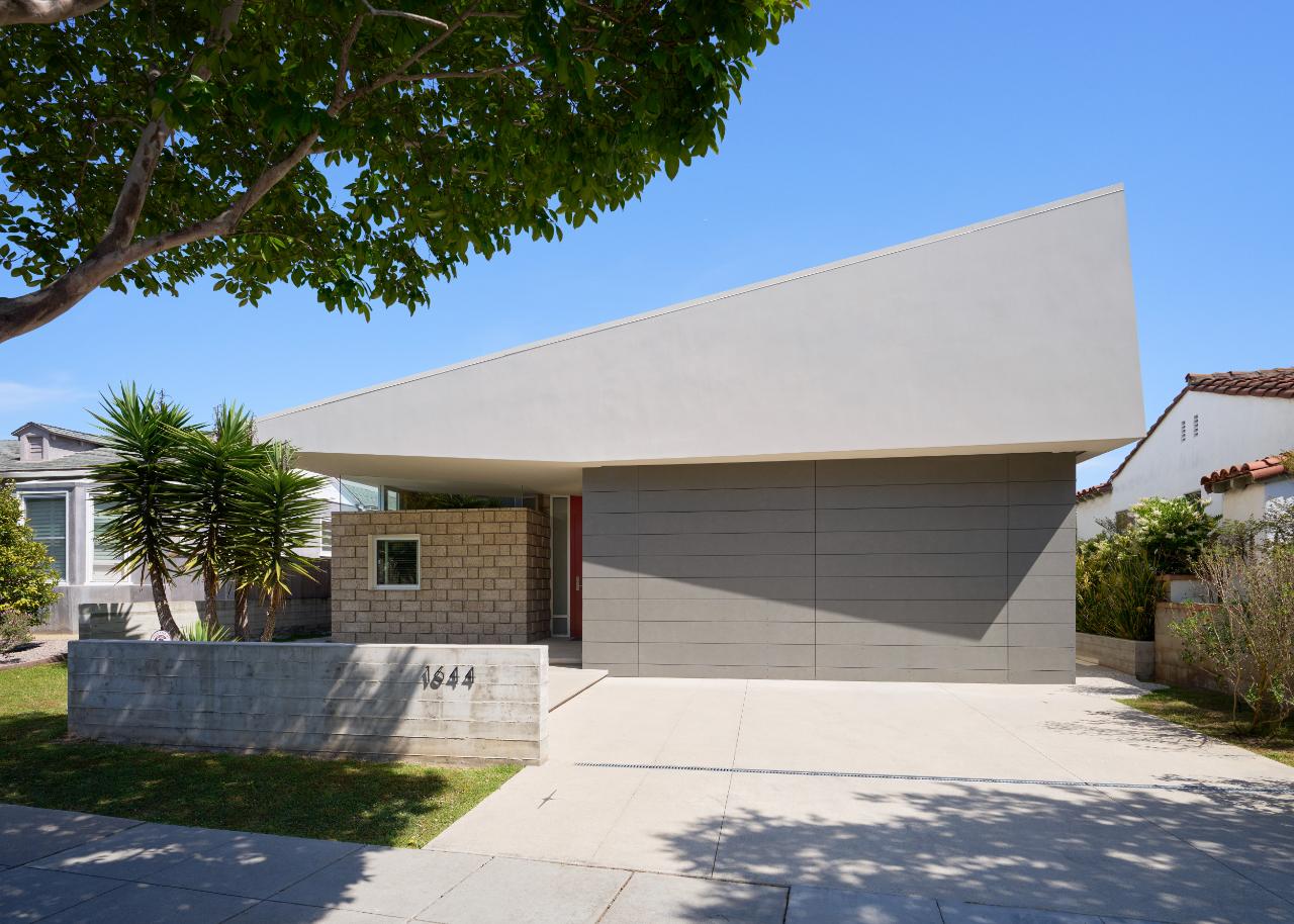 The front of the 1-story house reflects the client’s love of both the Flintstones and all things mid-century. The materials are chosen to be rugged and no-maintenance, and include board-formed concrete, concrete block, concrete panels, and integral-colored stucco. While the house is designed as a 1-story to allow the owner to age-in-place, the floating roof is not only very “Fred and Wilma”, it also is practical as it hides a storage attic and workspace.