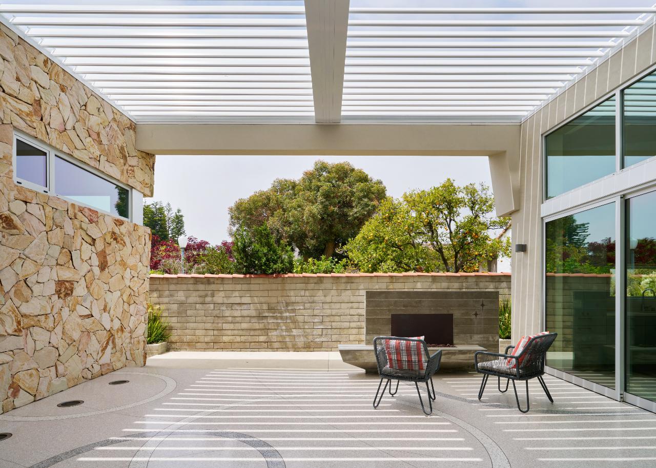 The house’s public rooms open on to a west-facing interior courtyard. Shaded by a mechanical louver system, the courtyard includes a fireplace and borrowed views of the neighbor’s orange trees. The south wall is faced in flagstone with mid-century flair, and the ground surface is a custom terrazzo with a pattern of sweeping arcs that connect into the adjacent kitchen.