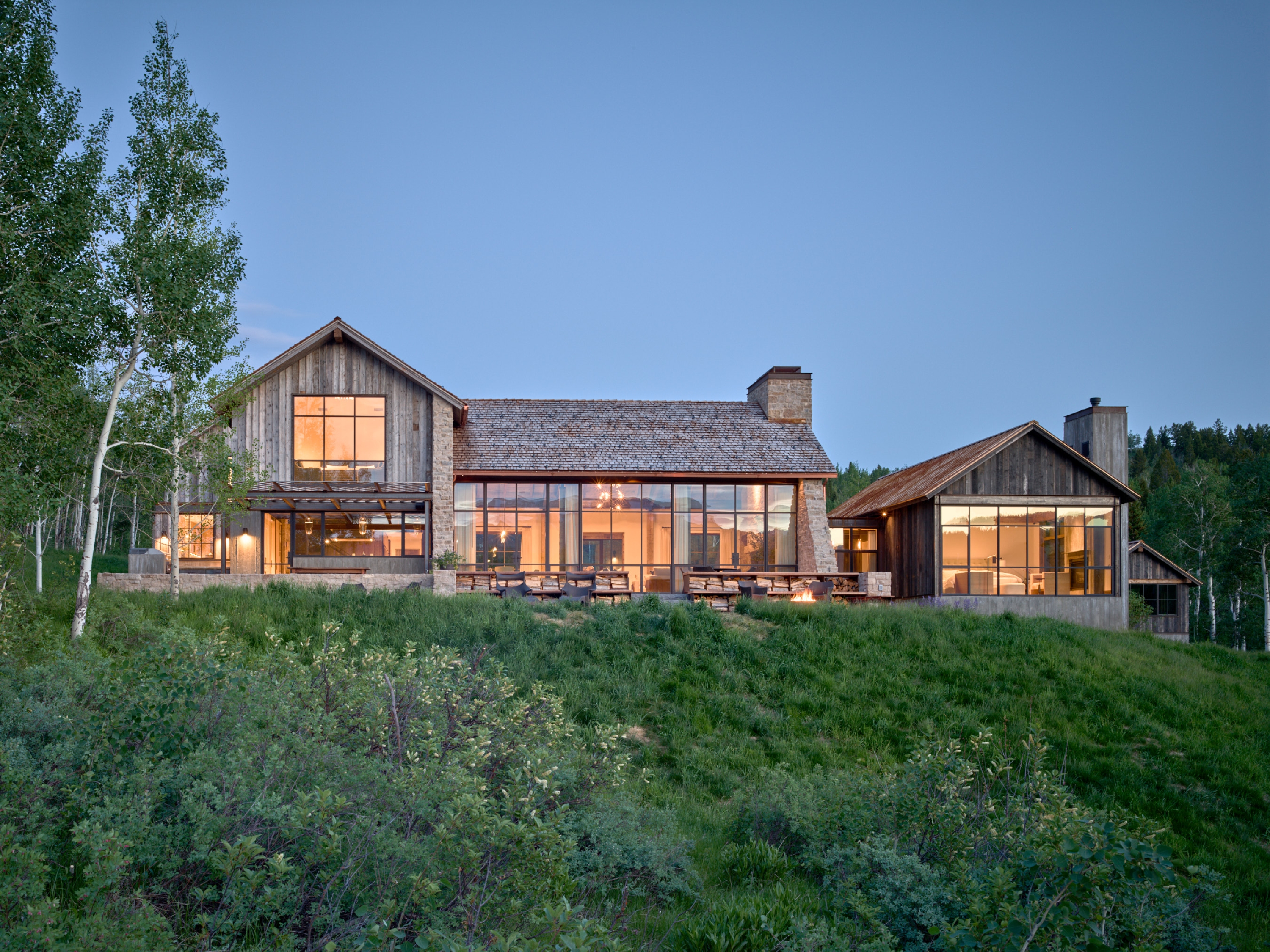 Built into the hillside among a stand of aspens, this Jackson Hole house deftly joins simple, clean-lined forms and remarkable walls of contemporary glass—taking in nearly the entire length of the Teton Range—with aged, character-rich timber and stone that ground the modern home in the ancient landscape and regional history.