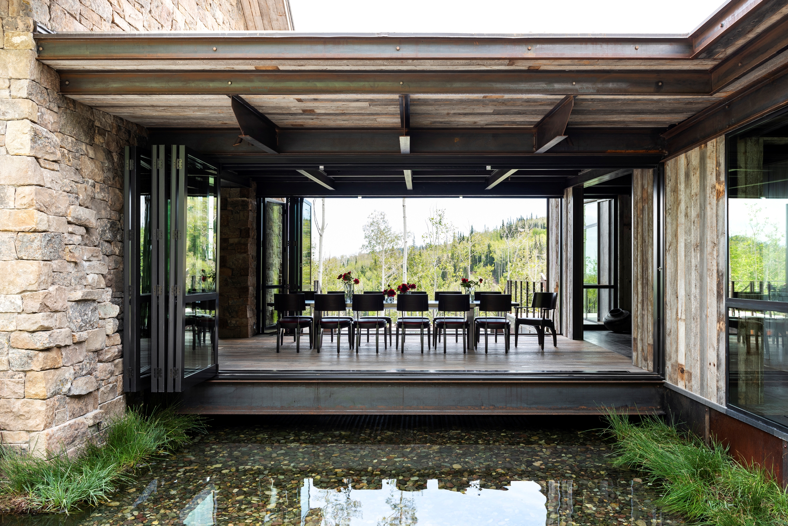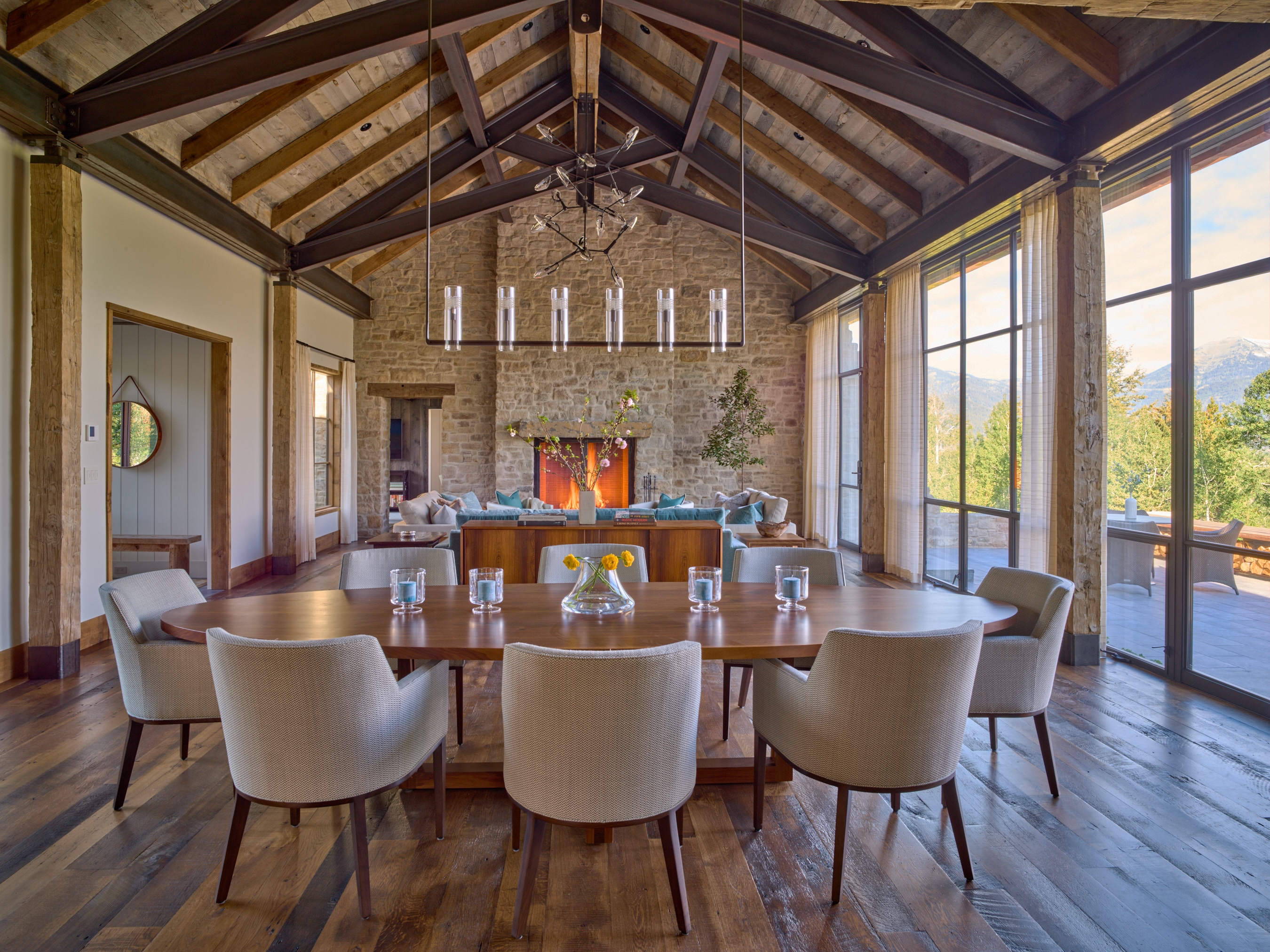 Light plays a starring role throughout the home, both naturally from the oversize floor-to-ceiling windows, as well as from indoor custom fixtures. Always, the connection to surrounding nature is paramount on the Jackson Hole site among aspen trees and meadowland with Teton mountain views. Easily accessible expansive outdoor living spaces enhance the indoor-outdoor connection, while rustic, regional fieldstone and reclaimed wood is juxtaposed with clean contemporary steel ceiling trusses, creamy plaster and walls of glass.