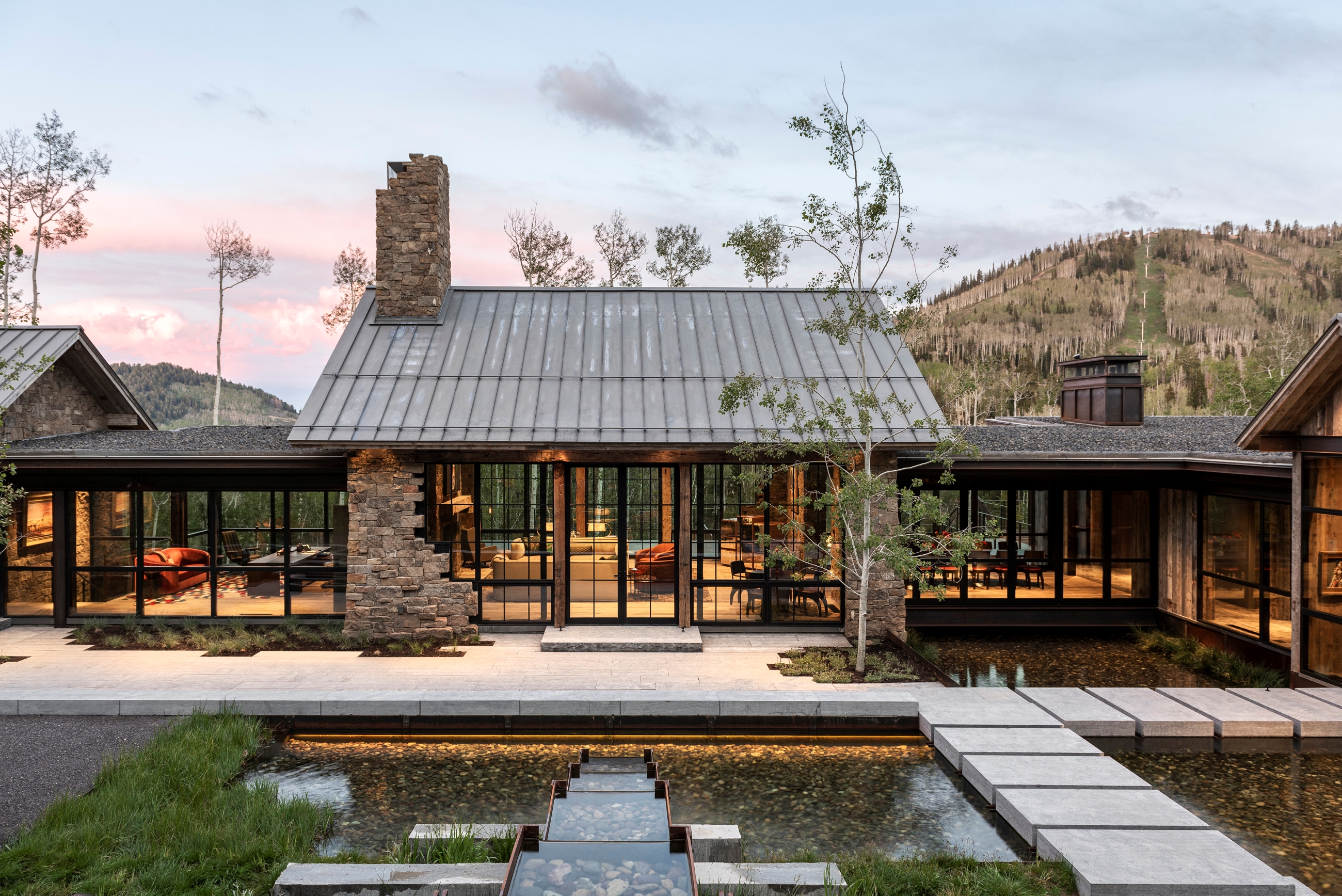 Light plays a starring role throughout the home, both naturally from the oversize floor-to-ceiling windows, as well as from indoor custom fixtures. Always, the connection to surrounding nature is paramount on the Jackson Hole site among aspen trees and meadowland with Teton mountain views. Easily accessible expansive outdoor living spaces enhance the indoor-outdoor connection, while rustic, regional fieldstone and reclaimed wood is juxtaposed with clean contemporary steel ceiling trusses, creamy plaster and walls of glass.