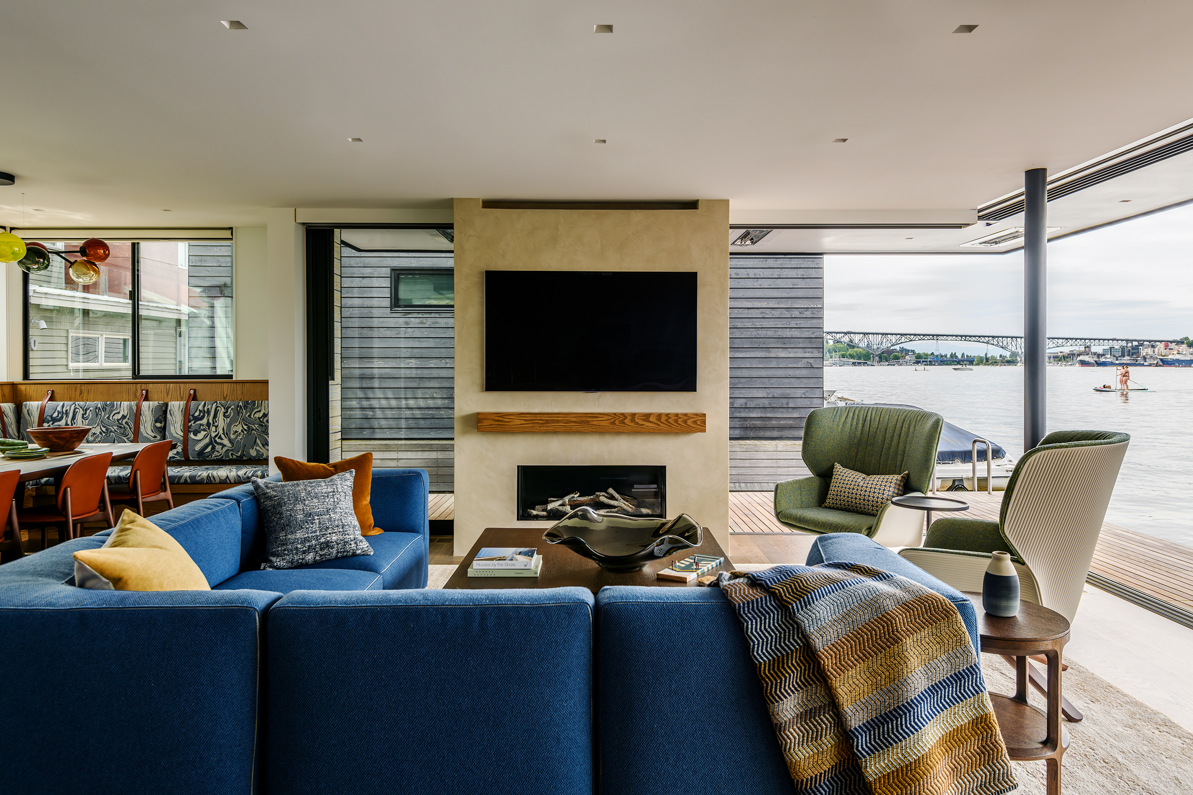 The Lake Union Floating Home balances modern design with a thoughtful response to lakeside living, where strategically composed solids and voids maximize views, natural light, and spatial flexibility. The primary bedroom is designed as a sanctuary, floating above the activity of lake life. Here, multi-slide glass doors allow the indoor-outdoor line to dissolve, while framing picturesque views across the water. A calm material palette and soft textures take their cues from dappled sunlight, shoreline landscapes and airy skies.