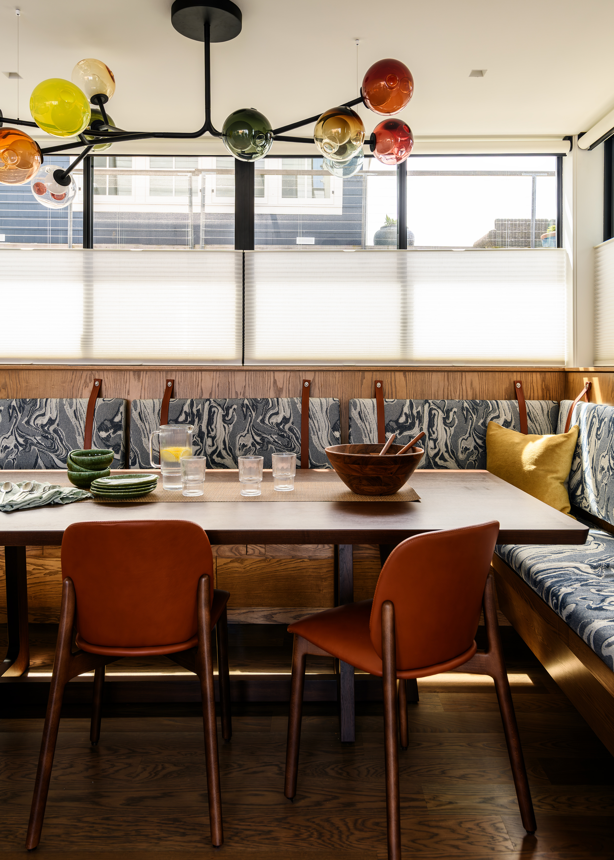 The great room is designed for both intimate gatherings and larger entertaining, with an open plan that draws the eye toward the water. Fixtures, finishes and furniture draw from a beach-inspired palette punctuated by pops of sunset color, reinforcing the home’s relaxed yet refined environment.