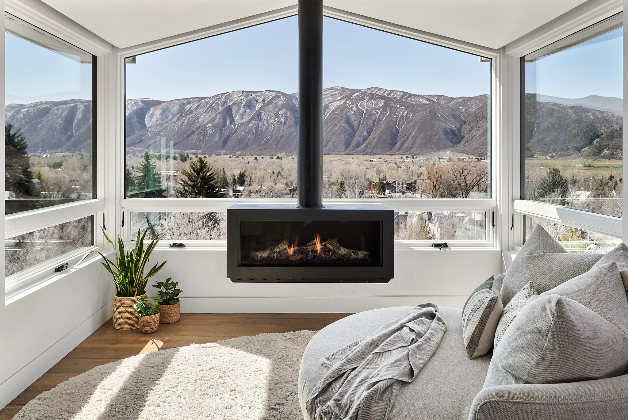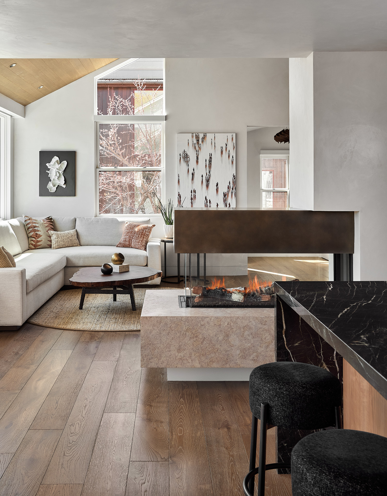 A three-sided fireplace anchors a modern open plan remodel. L+S worked with a dedicated art-collector owner to revitalize a quirky home built in 2000. Our main objective here was increasing the glazing to take in 270 degree sweeping views of the crown and Mt Sopris in the distance. To achieve a more calm atmosphere, we tucked new steel beams into the existing rafters and aligned head and sill heights throughout the home. Creating some simple alignments quieted an otherwise pell-mell feeling space and the overall impression now is a serene mountain escape.