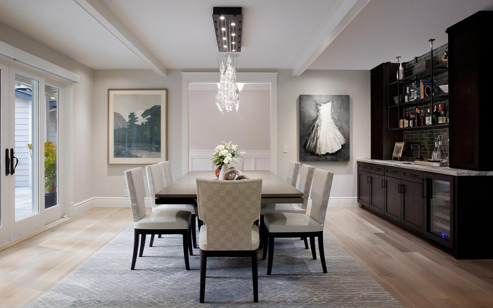 In the dining room, a scenic painting is paired with a complementary painting of a dress by Laura Schiff Bean, which the homeowners acquired together from Simon Breitbard Gallery. The dining table is by Randolph and Hein, from Sloan Miyasato, and the chandelier by Studio Bel Vetro. The dining chairs are by Anees Custom Upholstery.