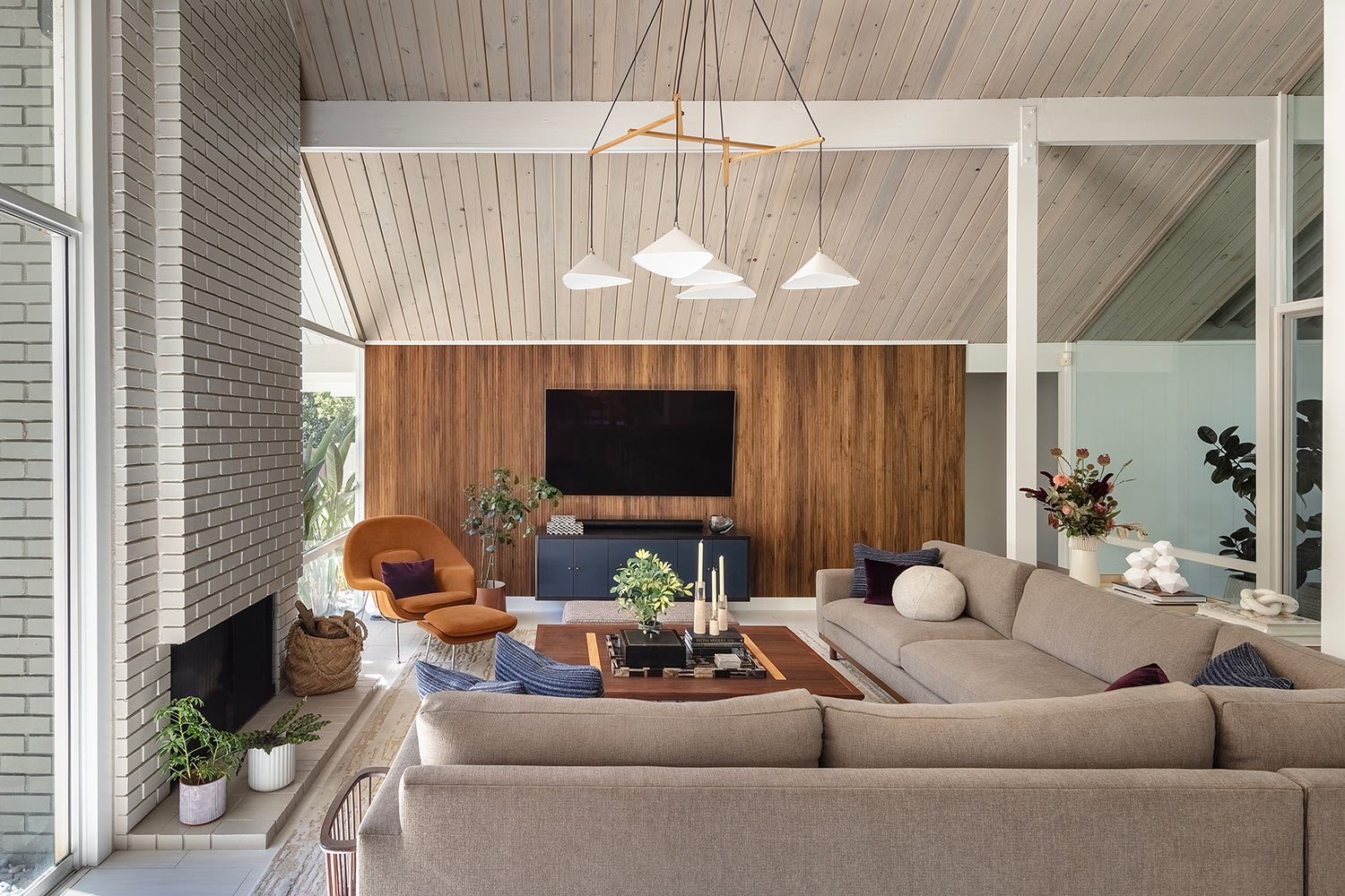 This sun-drenched Eichler living room is made ever-so inviting with a Matt O’Reilly sectional, pendant light fixture by Two Enlighten, and artwork by Isabella Despojols via Stephanie Brietbard Fine Arts.