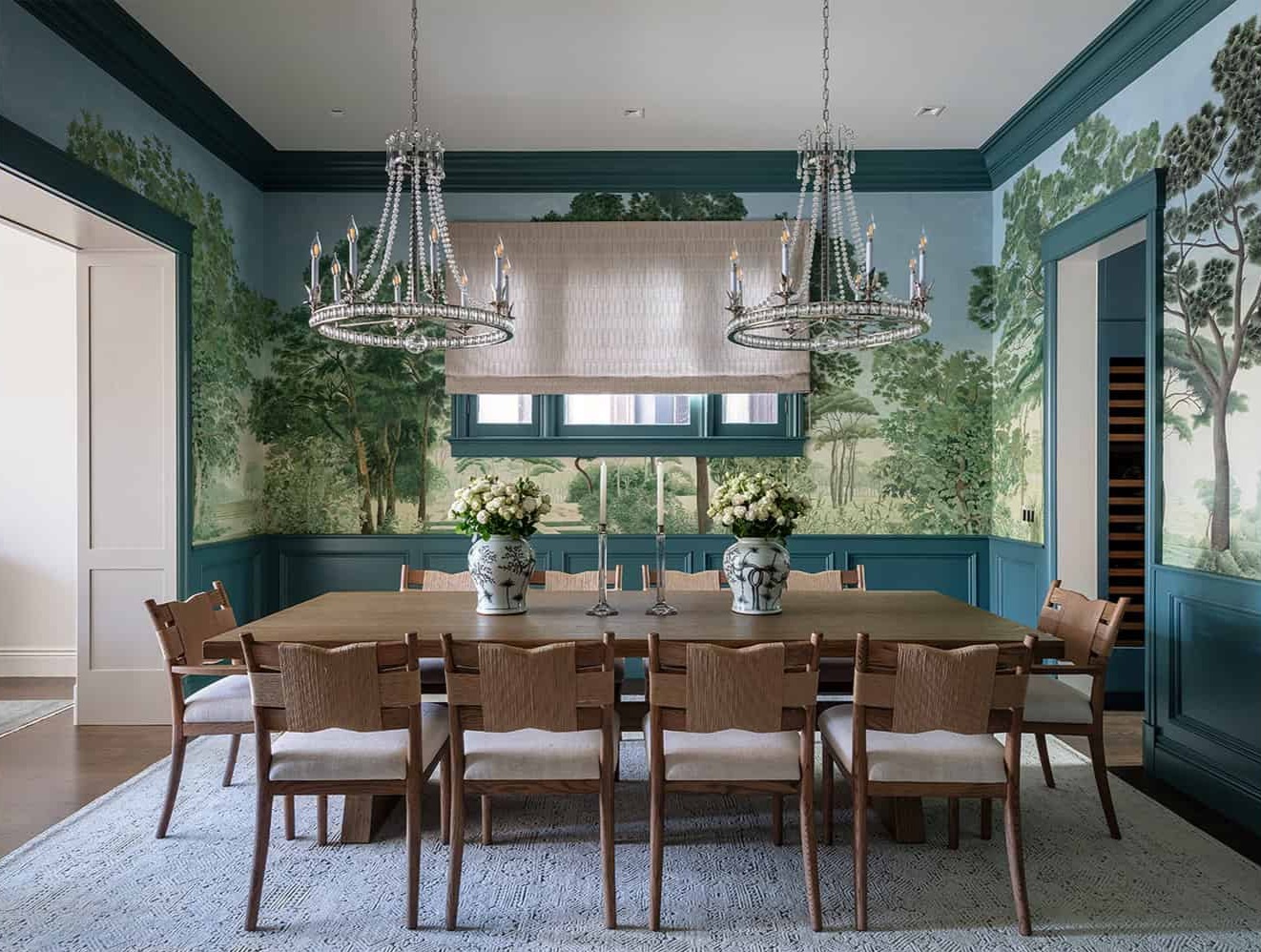 A cozy, jewel-toned dining room wrapped in Schumacher mural wallpaper, with crystal chandeliers, a pair of vintage Chinese porcelain vases from HEWN Showroom, and a warm wood table the family can’t help but dine at every night.