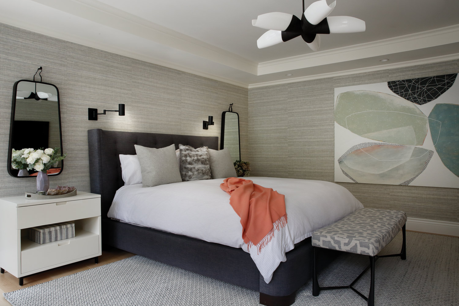 This bedroom is a balance of masculine and feminine touches, such as iron-finish mirrors from Arteriors and a painting by Karine Leger, from Simon Breitbard Gallery.