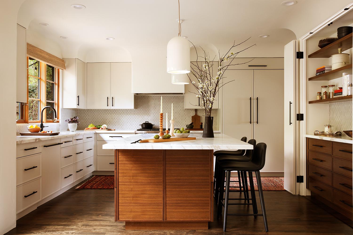 Featuring artwork by Sharon Paster of Simon Breitbard Fine Art Gallery above a vintage find midcentury bar cabinet from Narrative Oak, we love how this space invites visitors to sit at the kitchen without being in the kitchen.