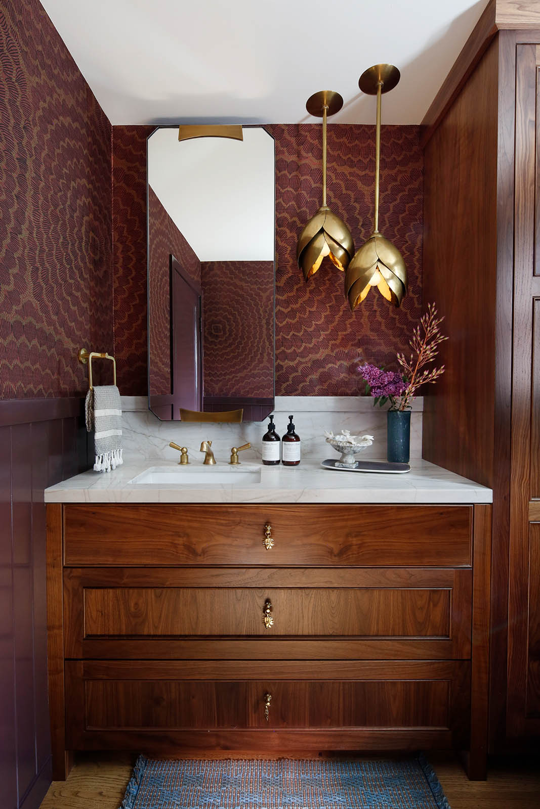 This showstopping powder room is brought to life with bold Shumacher wallcovering and a duo of pendants by Arteriors.
