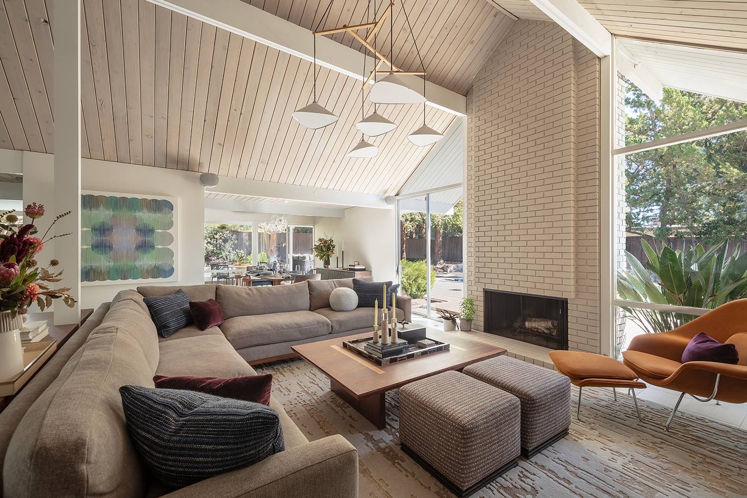 This sun-drenched Eichler living room is made ever-so inviting with a Matt O’Reilly sectional, pendant light fixture by Two Enlighten, and artwork by Isabella Despojols via Stephanie Brietbard Fine Arts.