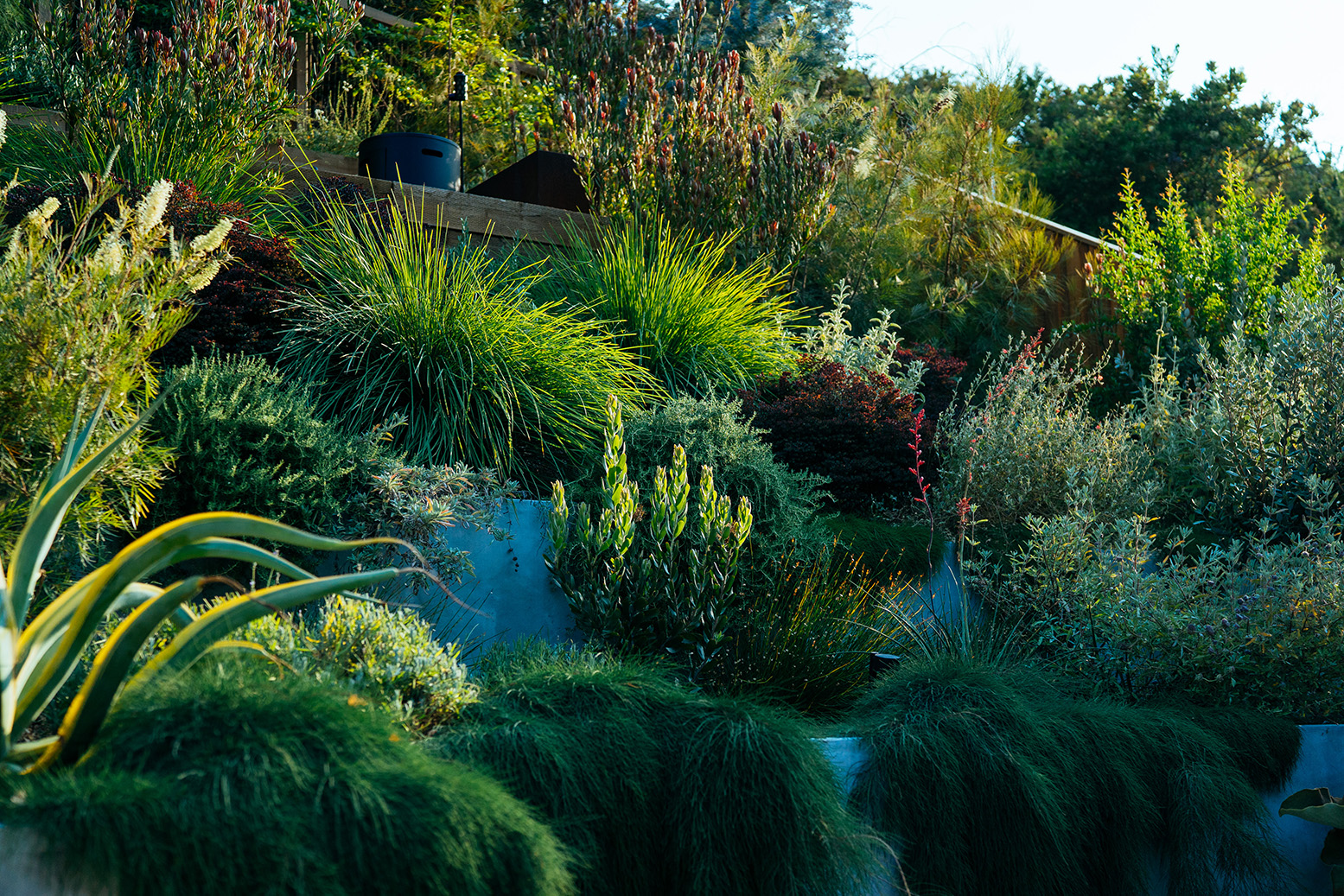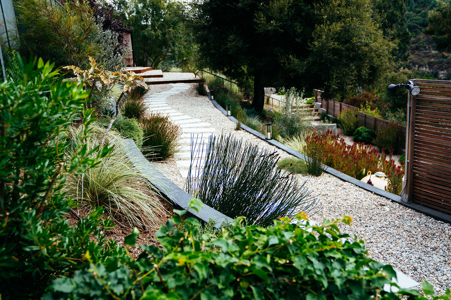 Terraced hillside and outdoor living sanctuary in Topanga Canyon, drought tolerant and pollinator friendly, regenerative and engaging, we built on grade, working with land and people to engage beauty
