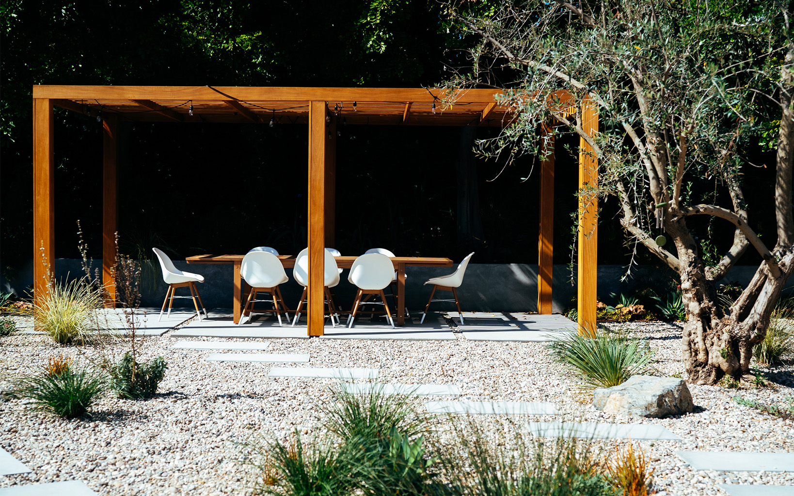 Custom pergola and refurbished retaining walls create fluidity between terraces and invite a spirit of connection in t his drought tolerant, fire flood resilient and pollinator friendly play garden
