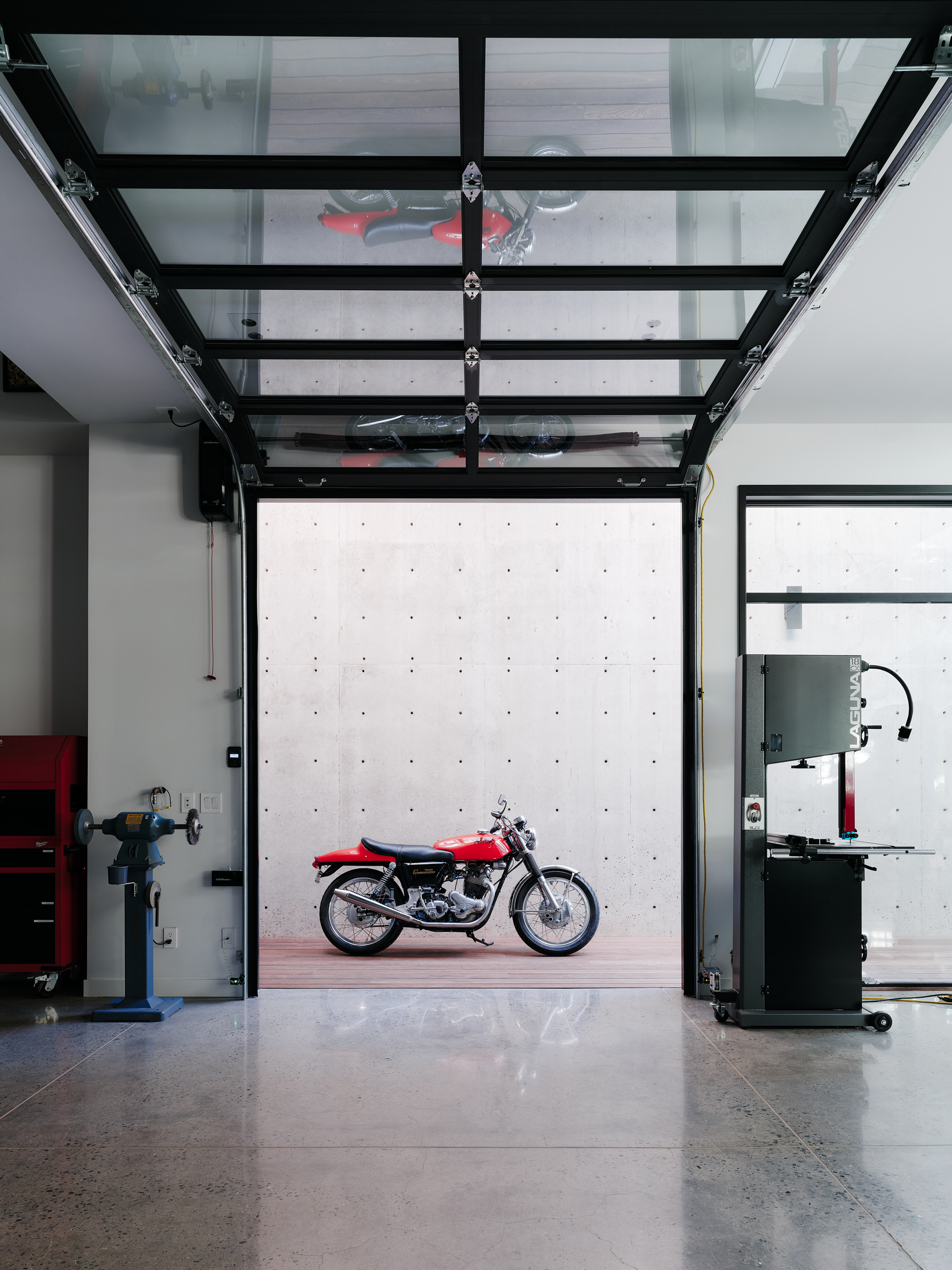 A subterranean workshop, complete with car lift, supports hands-on design and creative experimentation at home.