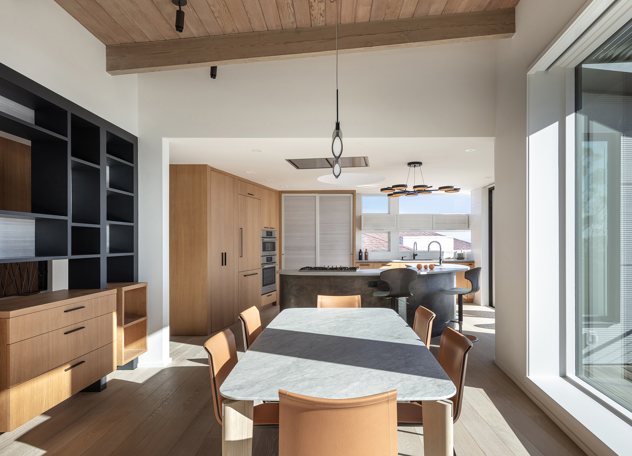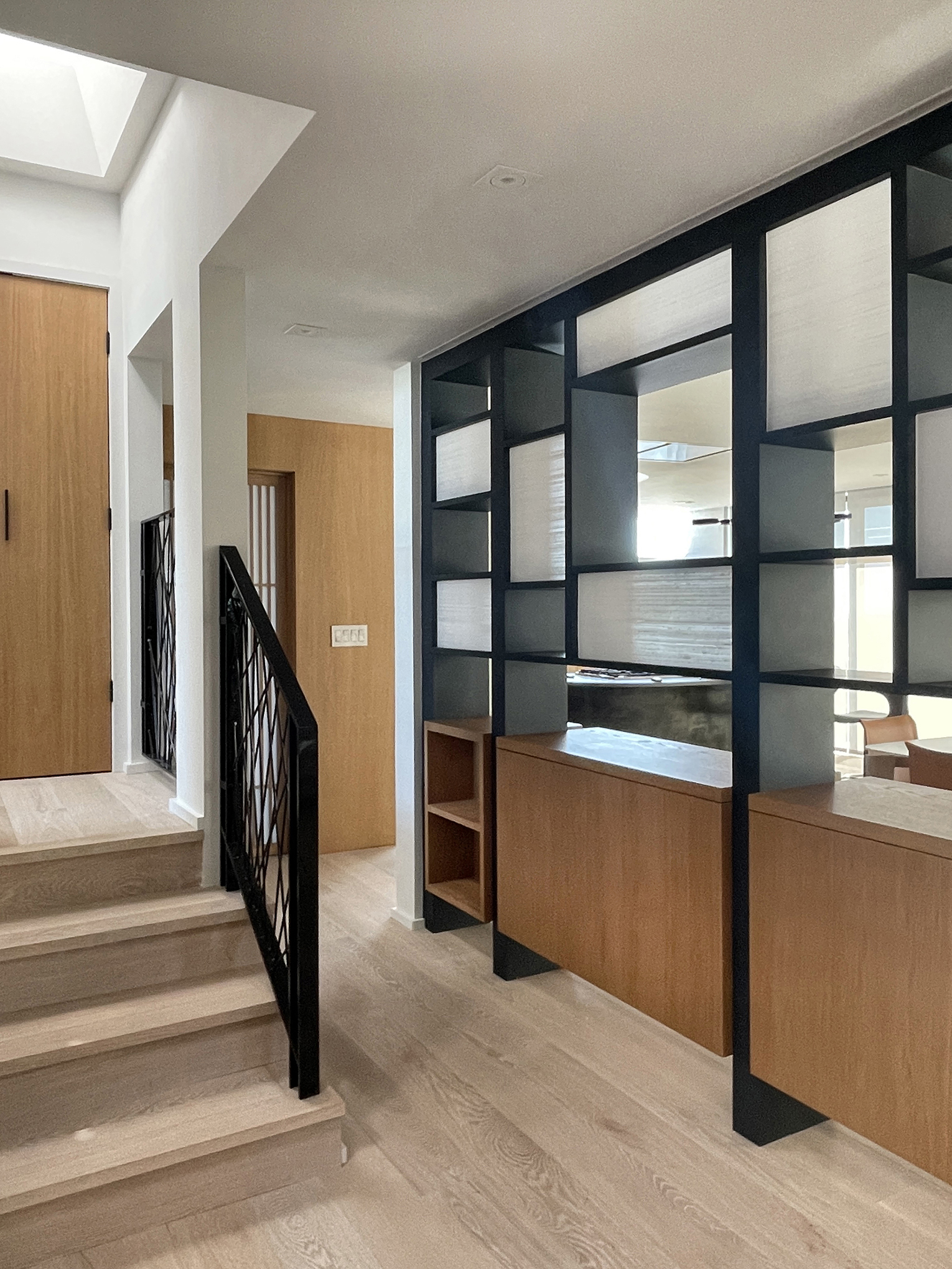 A wood partition with cabinets below help define the entry on one side and the dining room on the other. Upon entering the home, one gets glimpses through this element, hinting at the view beyond. A guardrail with steel rods laid up in a random stick-like pattern, leads to the primary bedroom at the left of the photo.