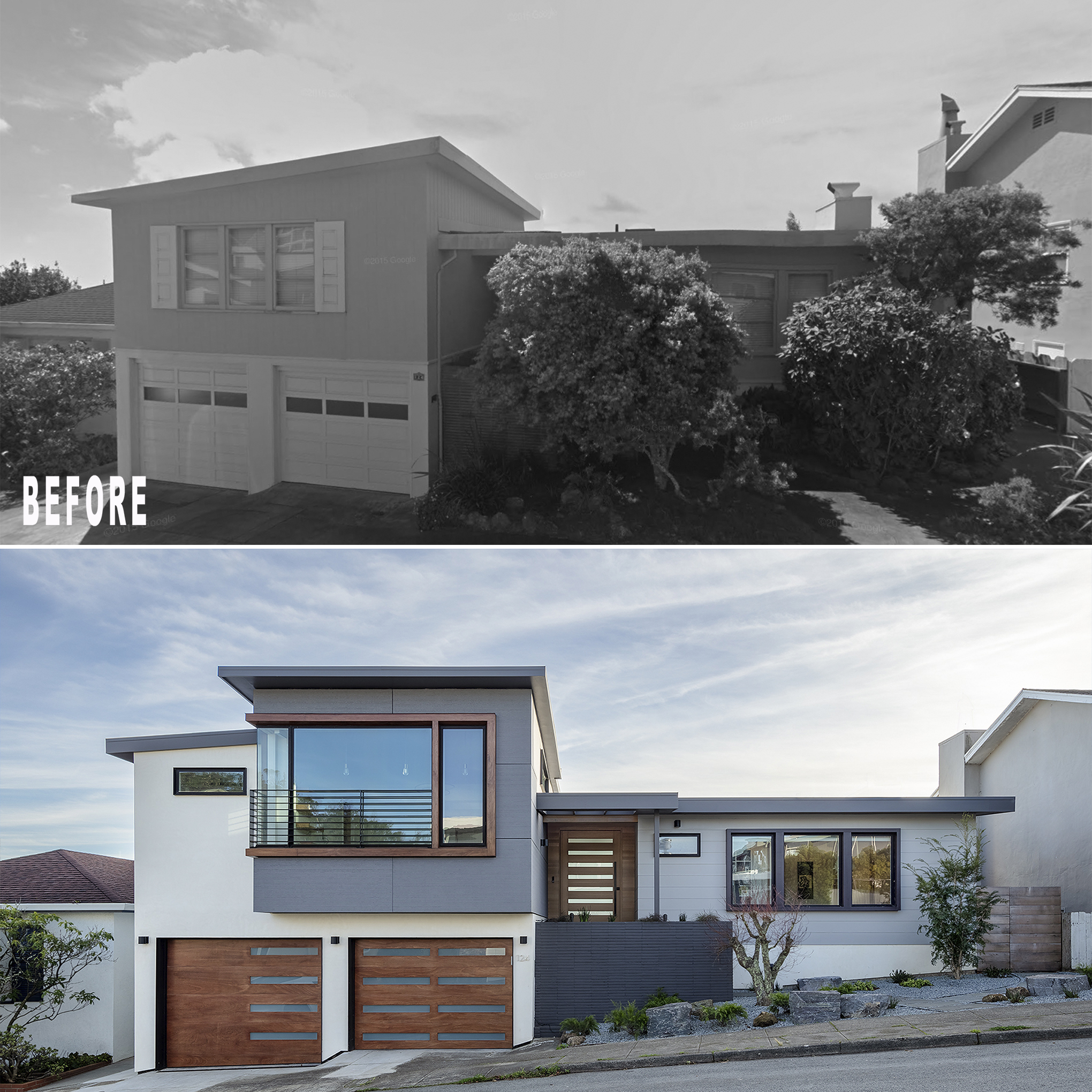 The original house was designed by John S. Bolles (best known for this design of Candlestick Park) and had a great mid-century vibe to it, but the front was rather lifeless. It was also a bid odd, in that the three windows above the garage relate to different spaces – the two on the right illuminate the primary bedroom and the one to the left is to the walk-in closet. We decided to make form follow function and create an extension to the bedroom, emphasizing the main function of this wing of the house.