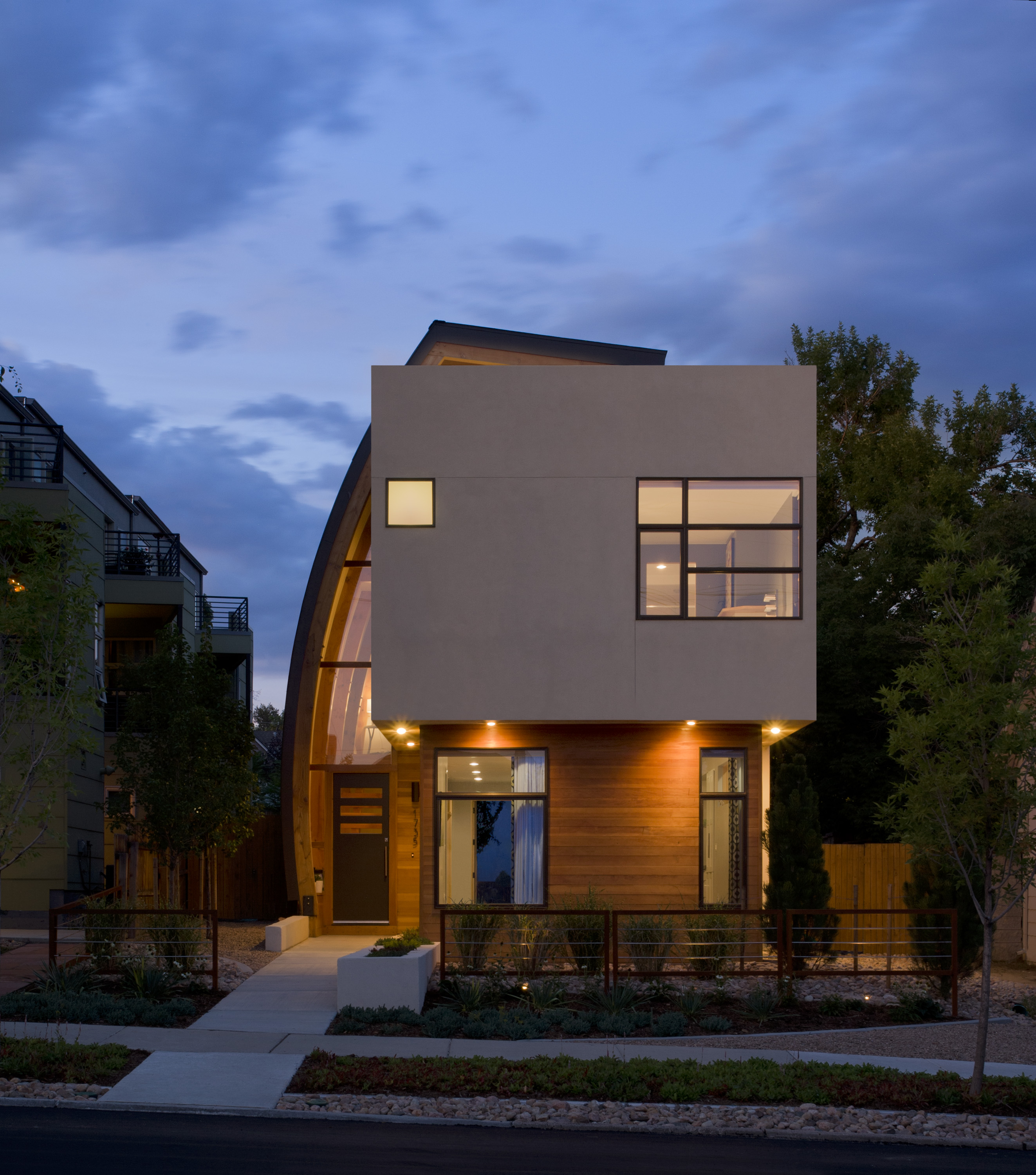Shield House – This urban infill project juxtaposes a tall, slender curved circulation space against a rectangular living space. The tall curved metal wall was a result of bulk plane restrictions and the need to provide privacy from the public decks of the adjacent 3- story triplex. This element becomes the focal point of the residence both visually and experientially. The shield acts as sun catcher that brings light down through the house from morning until early afternoon. At night it becomes a glowing, welcoming sail for visitors.