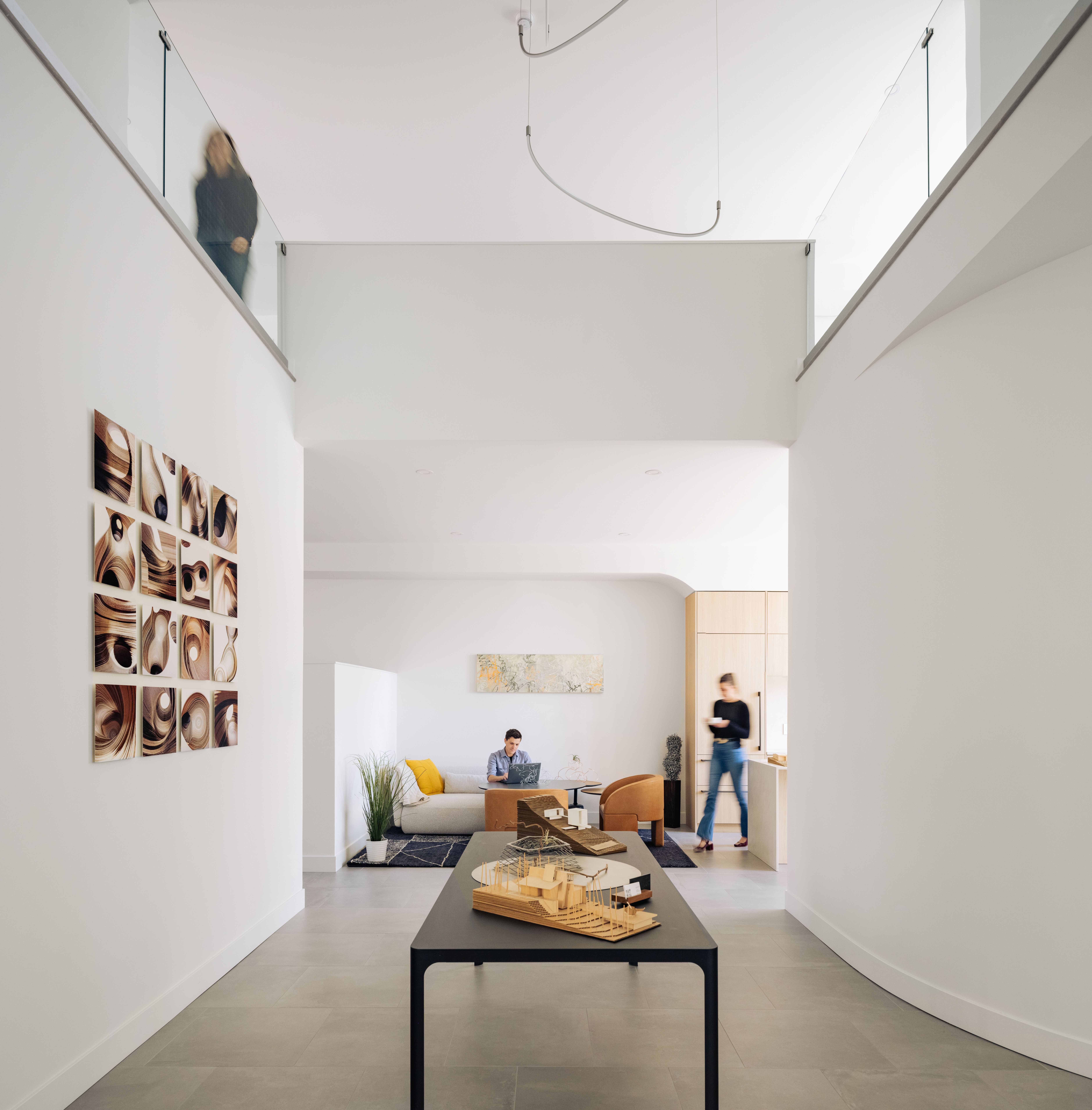 LoHi Live/Work – An urban infill structure that reconsiders the traditional notion of living above the office. The lower office / showroom massing respects the traditional two-story scale of the block while dovetailing into the 45′ tall form of newer neighborhood construction. The gentle west wall alley curve is a response to the required alley site triangle, transforming the design language from a cartesianal blocky approach to a project of fluid interlocking forms. The main level of the residence and deck above is 20+ feet above ground level allowing for spectacular views of the cityscape beyond.