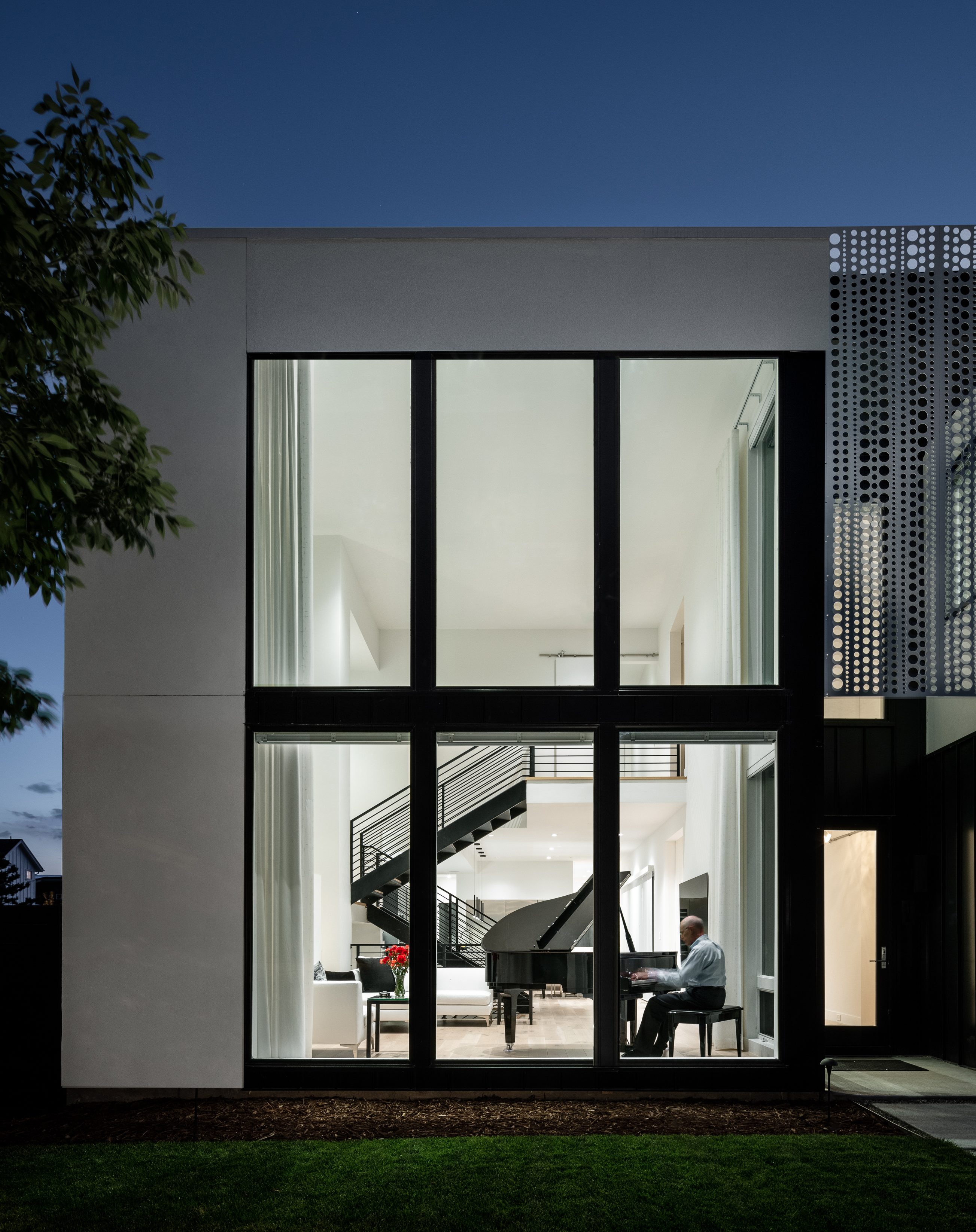 Pianoforte Residence – Inspired by our clients’ love of all things piano, the residence interprets the masculine form as ‘loud’ and the play of light as ‘soft’. The L-shaped plan addresses the active street corner while providing protection to the rear outdoor landscape. The entry becomes a gateway into this secret garden. Light breathes life into the living space in the morning and pours into the kitchen from the southern clerestory above. Working organ pipes surround the fireplace enclosure in a pattern reflected in the perforated panels that screen the entry and filter light into the residence.