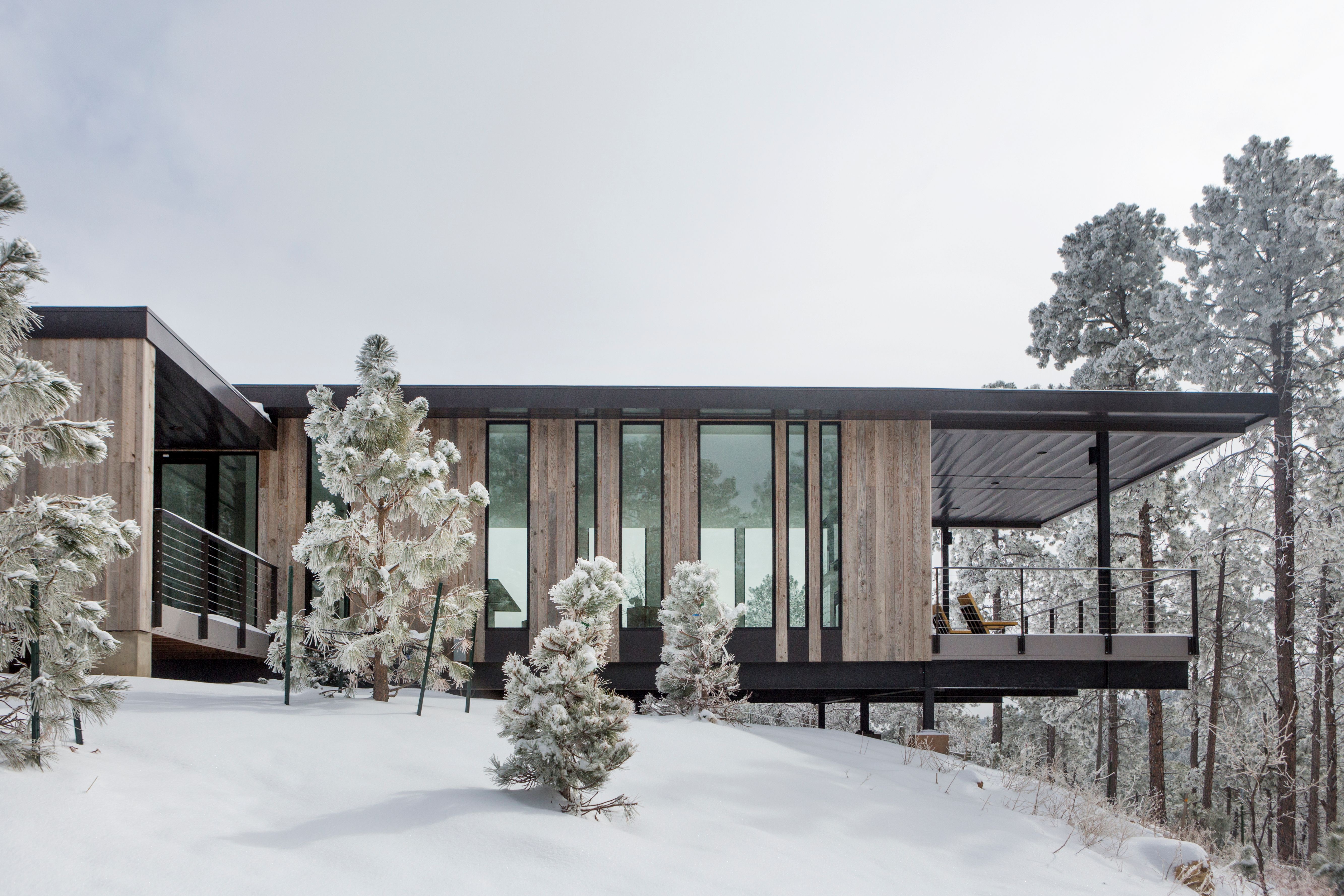 Black Hills Guest House – The Cottage takes advantage of the meadow views and utilizes a cantilever to reach out and overlook the treed ravine below. The irregular cadence of slotted windows tunes transparency and opacity as inspired by the trees. The project configures two modules on a single level for an open floor plan layout. A central service core is accessed from all four sides while separating the public and private halves of the house. The windows meld the house to with its treed surroundings, while the cantilevered launch over the ravine highlights the site’s dramatic topography.