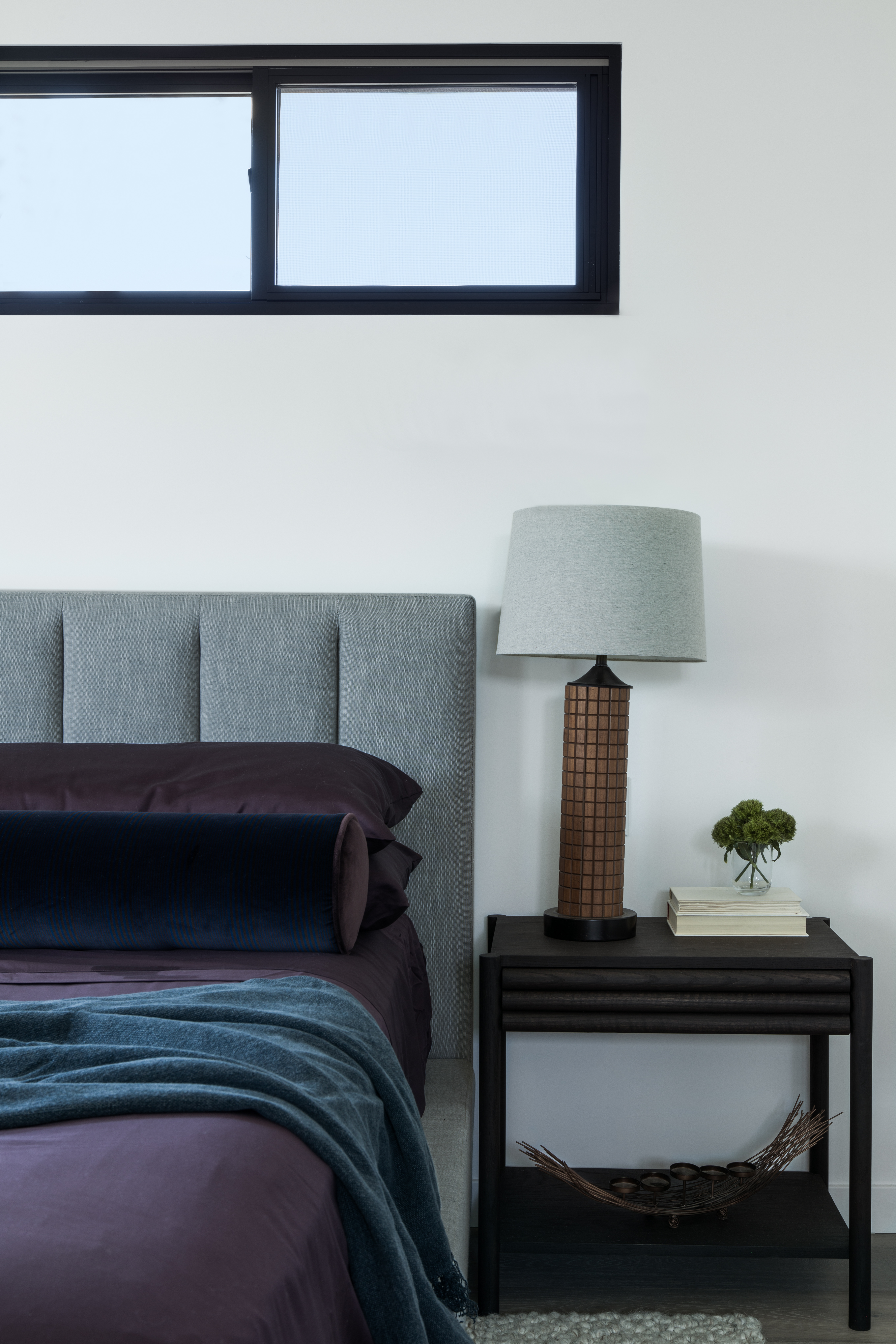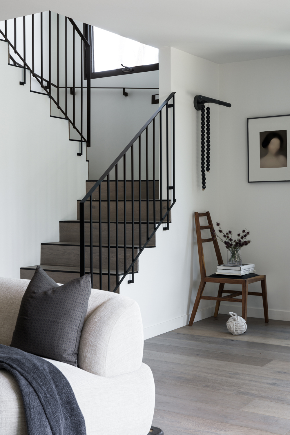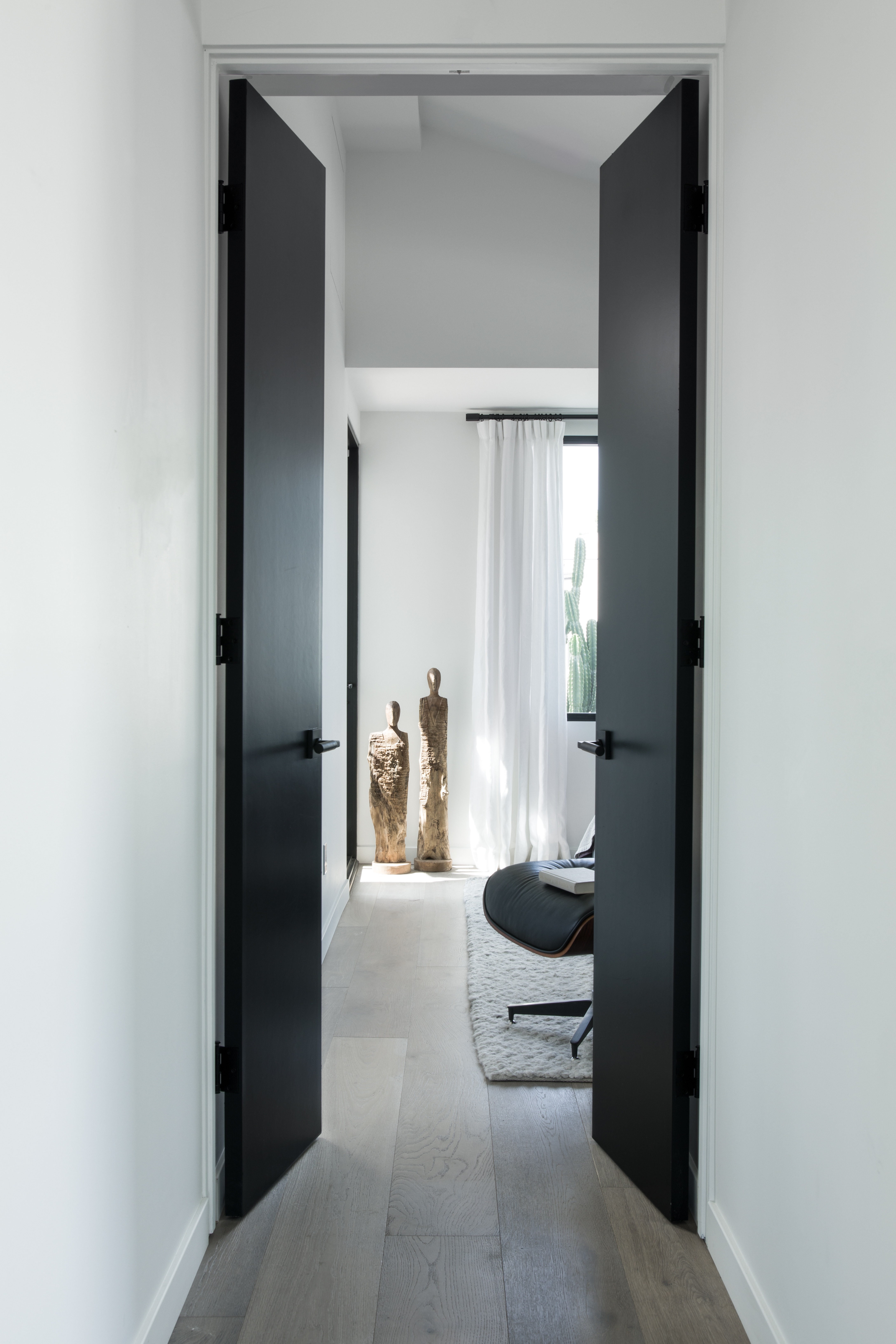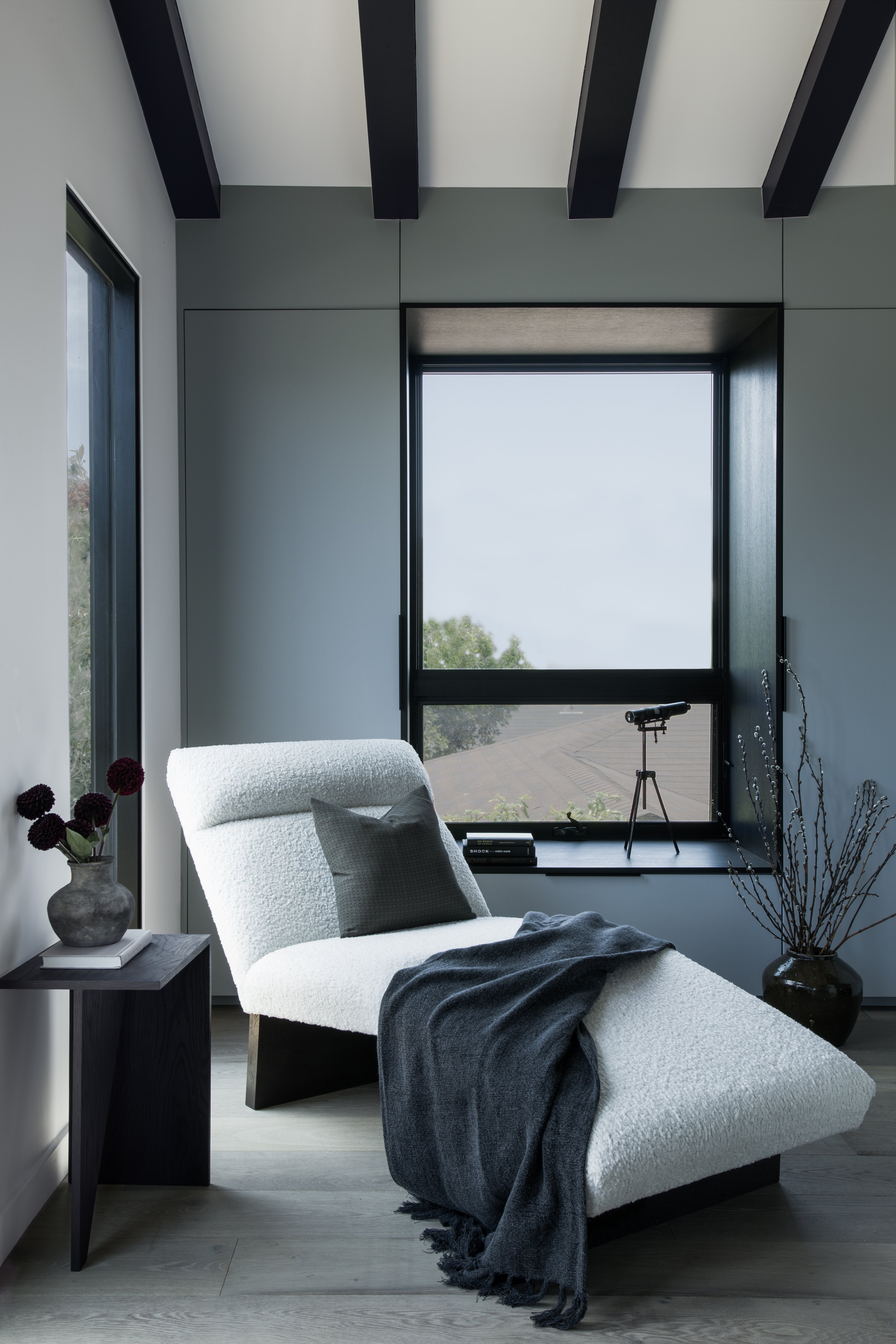Upstairs, the team decided to pitch the ceilings in the guest bedroom to tie it in with the exterior of the home. “[It also] added significant height and overall increased the size of the rooms,” says Schneider. Here, the office features a lounging chaise and a beautifully neutral palette to complement the black tones throughout the room.