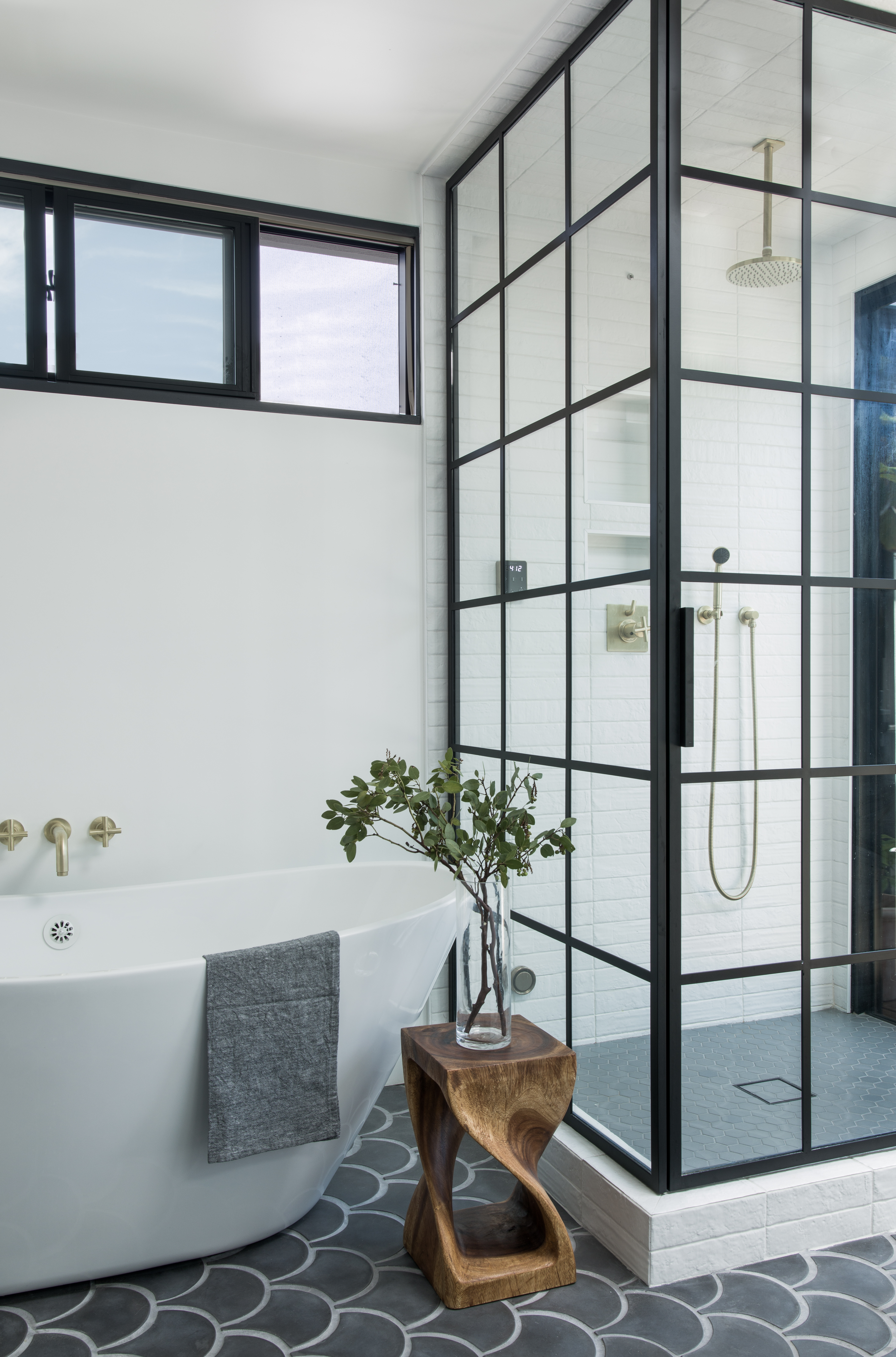 “As a team, we accounted for the smaller space by having a continuous neutral palette throughout the home, but still added small moments of impact like matte black doors and hardware with a pop of brass,” says Riley. “These tiny details really stand out and make the space feel methodical yet artistic.”