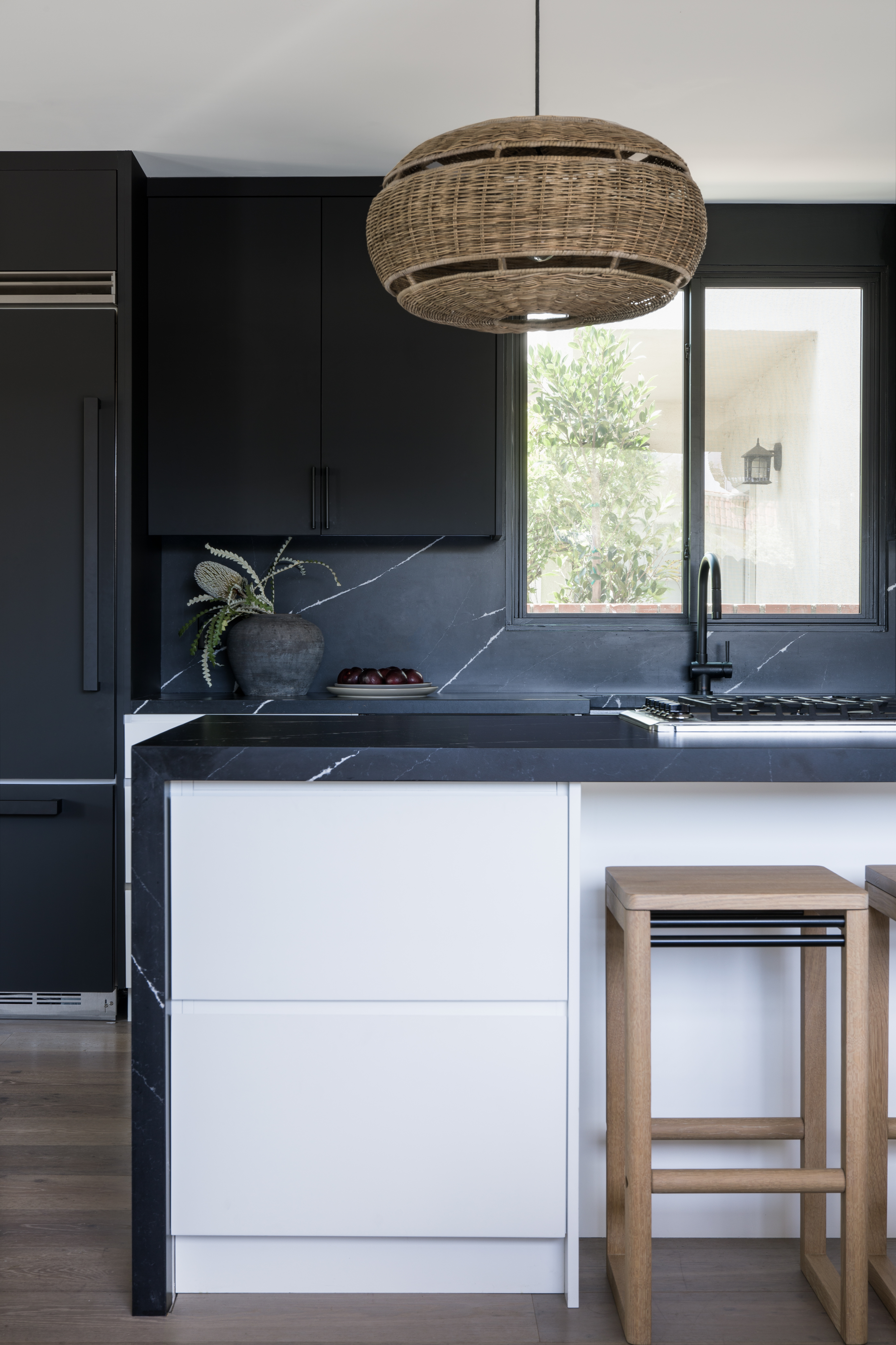 The home was originally built in 1953, and the team took it down to the studs to recreate the floor plan, reinforce the foundation, and even install new windows and doors. The scope also included a brand-new kitchen with a moody, black stone waterfall edges and backsplash against black cabinets, balanced by the natural tones of the bar stools and hanging pendant light. “The juxtaposition with hints of white and wood elements for warmth provided a statement kitchen that isn’t too dark. It feels livable,” says Jenna Rochon, the third Transition State co-founder.