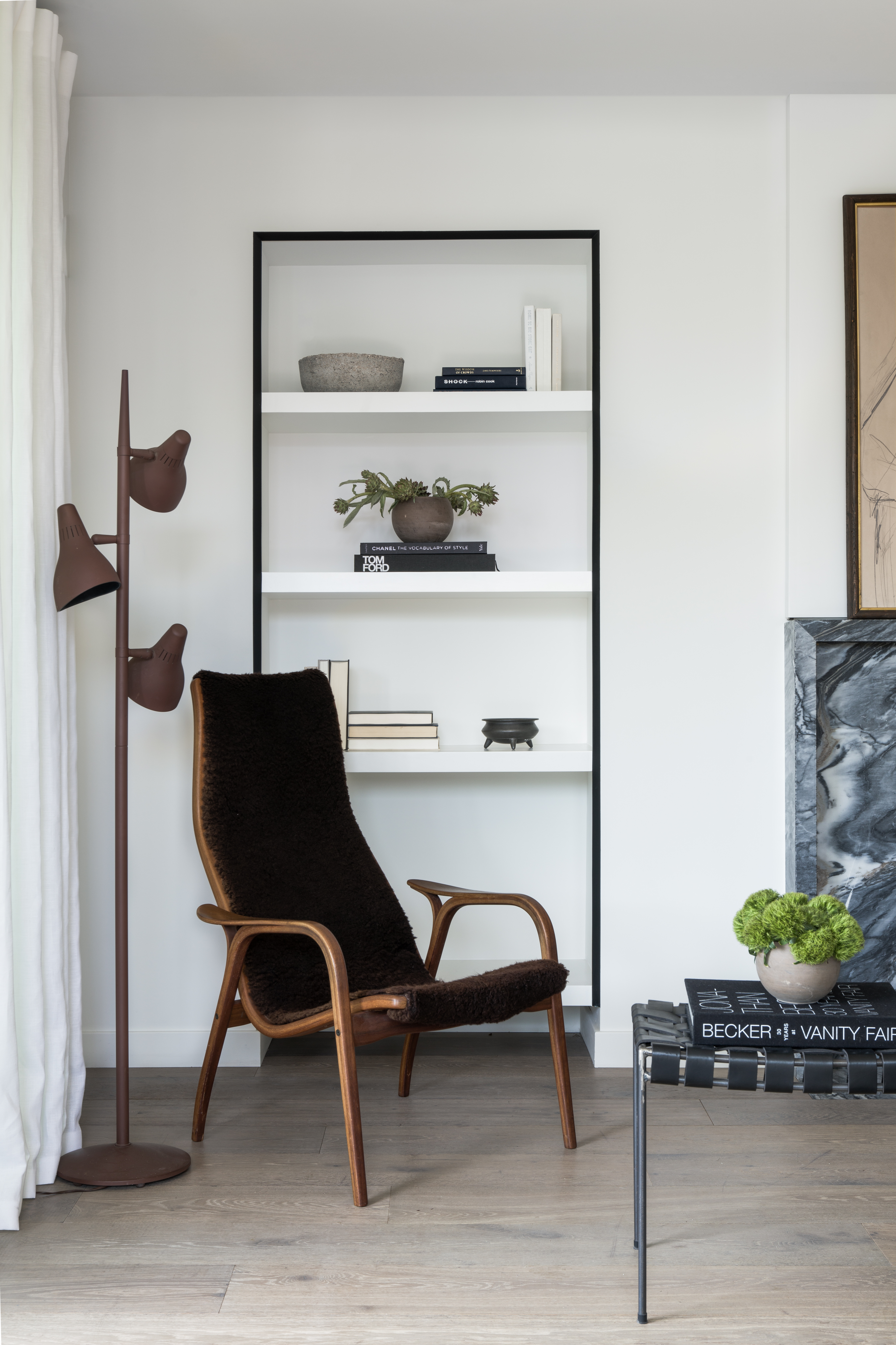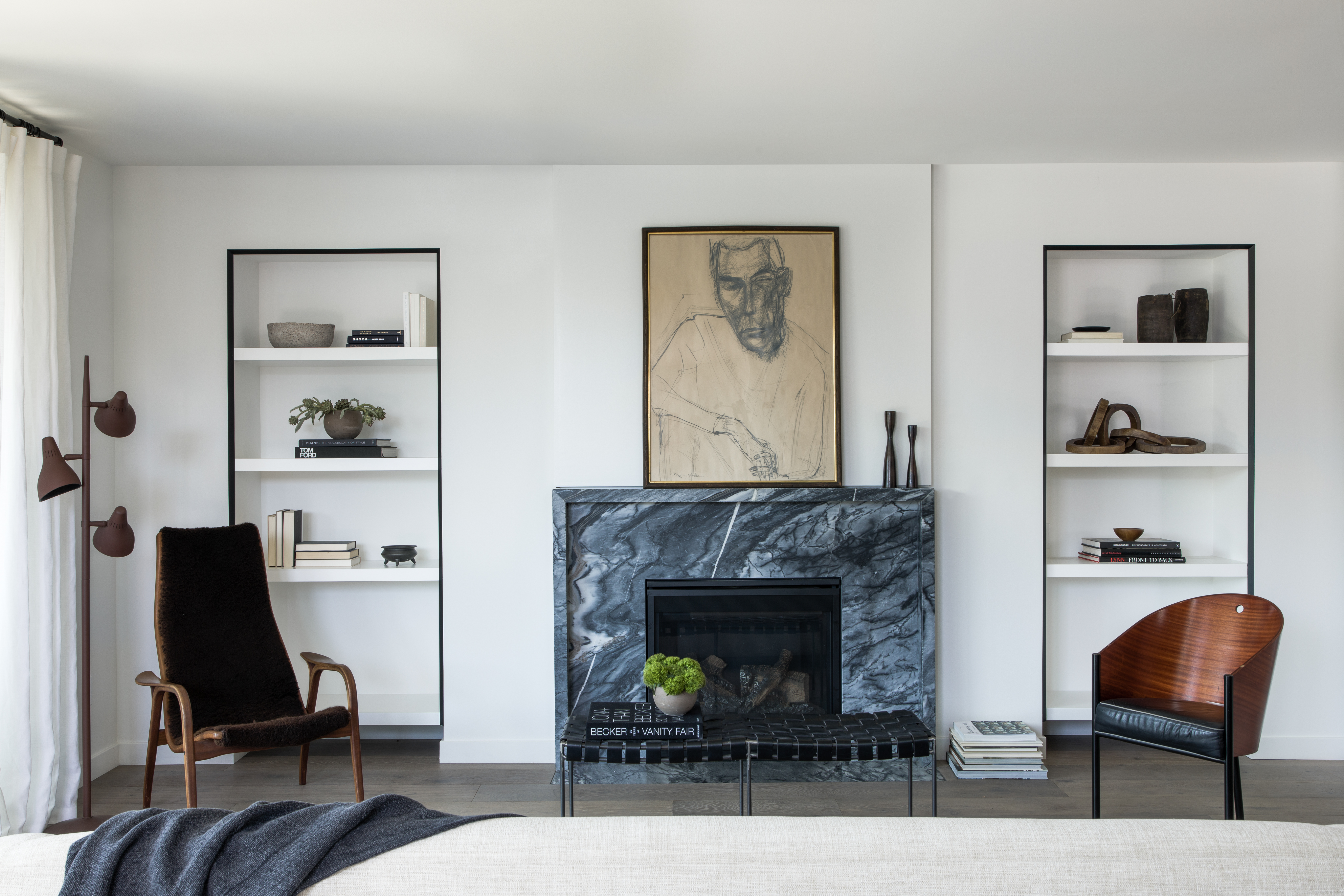 The matte black framing around the built-in bookshelves adds minimalist flair to the living room.