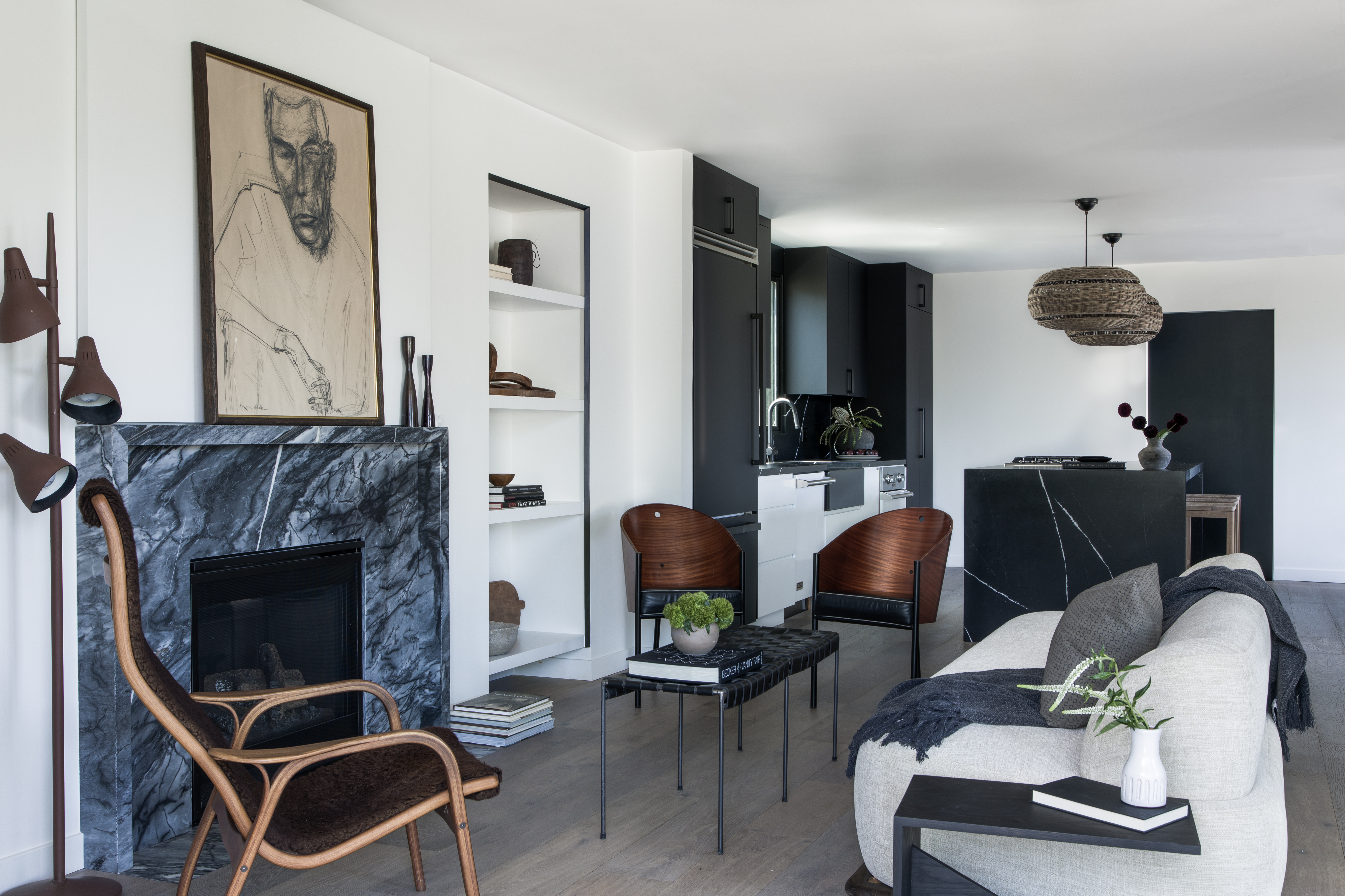“Ultimately, we decided to keep the bones of the space neutral with clean, crisp lines, but balanced it out with moments of warmth, texture, and drama through furnishings and accents to seamlessly blend the home,” says Kelli Riley, another Transition State co-founder. “We love a moody moment so we took dramatic finishes to the fireplace surround, kitchen, and powder room to create unique elements of surprise.”