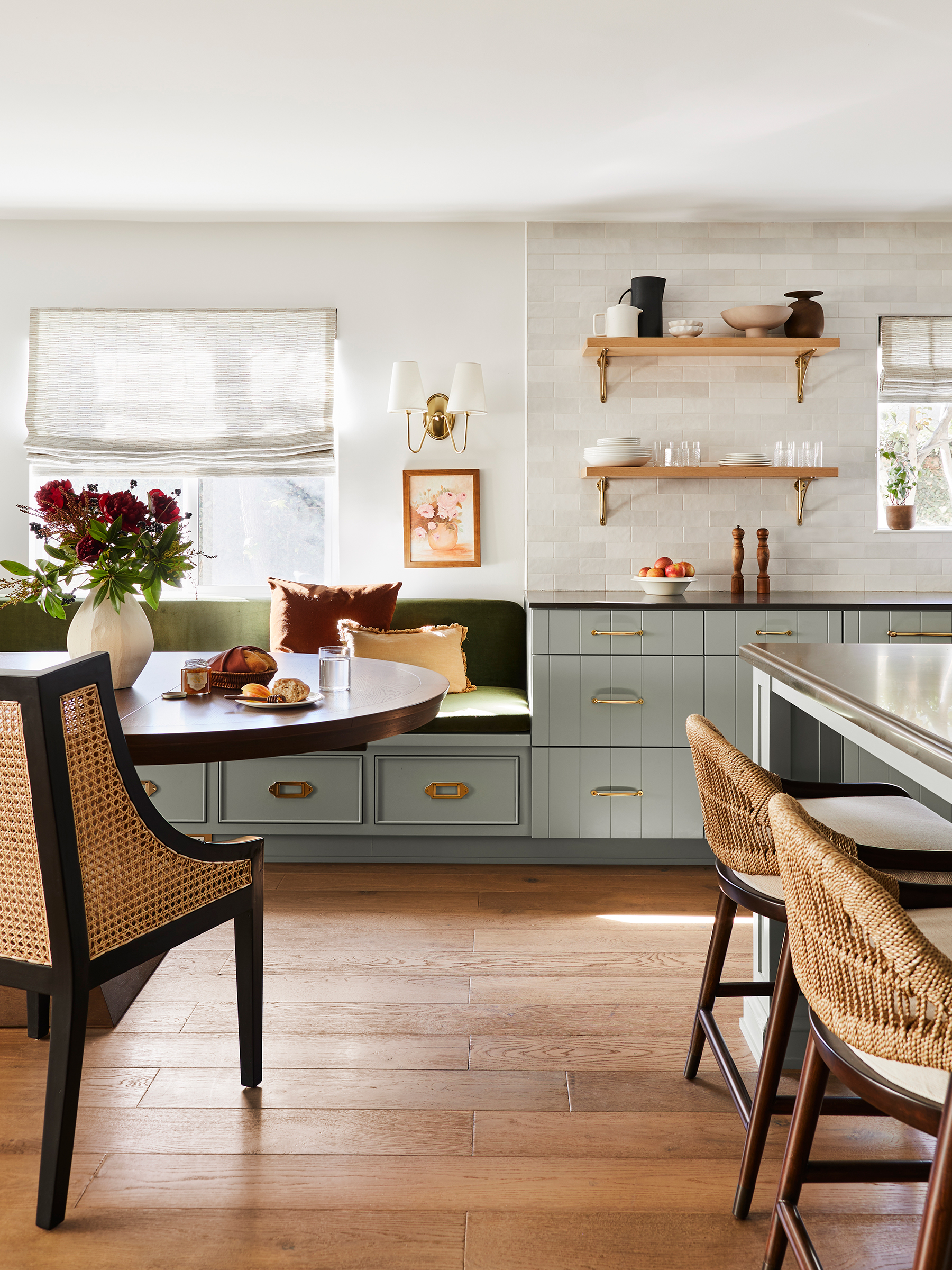 Linette created a new layout for them that included a cozy banquette that could comfortably seat the entire family, a wall of built-ins, a floor-to-ceiling pantry, a refrigerator, an integrated bar, and a china display cabinet. There was also a new island with a ton of storage space and open shelving to make the space feel brighter. In addition to a larger kitchen with more storage and working spaces for prepping and cooking, the clients wanted a proper dining area that was part of the kitchen. Aesthetically, they wanted the space to feel timeless, yet fresh.