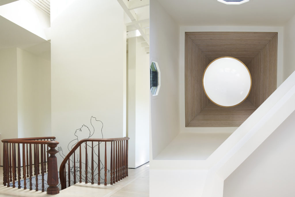 Original murals by Italian artist Roberto Ruspoli and restored railings were original to the home. The murals escort visitors up the stairs to the very top floor of the building, which is light, open, and airy. The steeple feature seen from miles away was opened up and restored to reward visitors and continue the feeling of elevation.