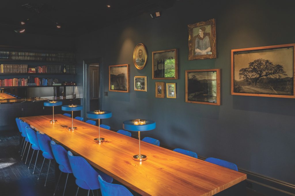 Shown here is the library room, where blue hues range from the crushed velvet upholstery to the muted cobalt of the walls. Framed tintype-style portraits by Lindsay Ross show vineyard workers as well as the Coombsville AVA vineyards.