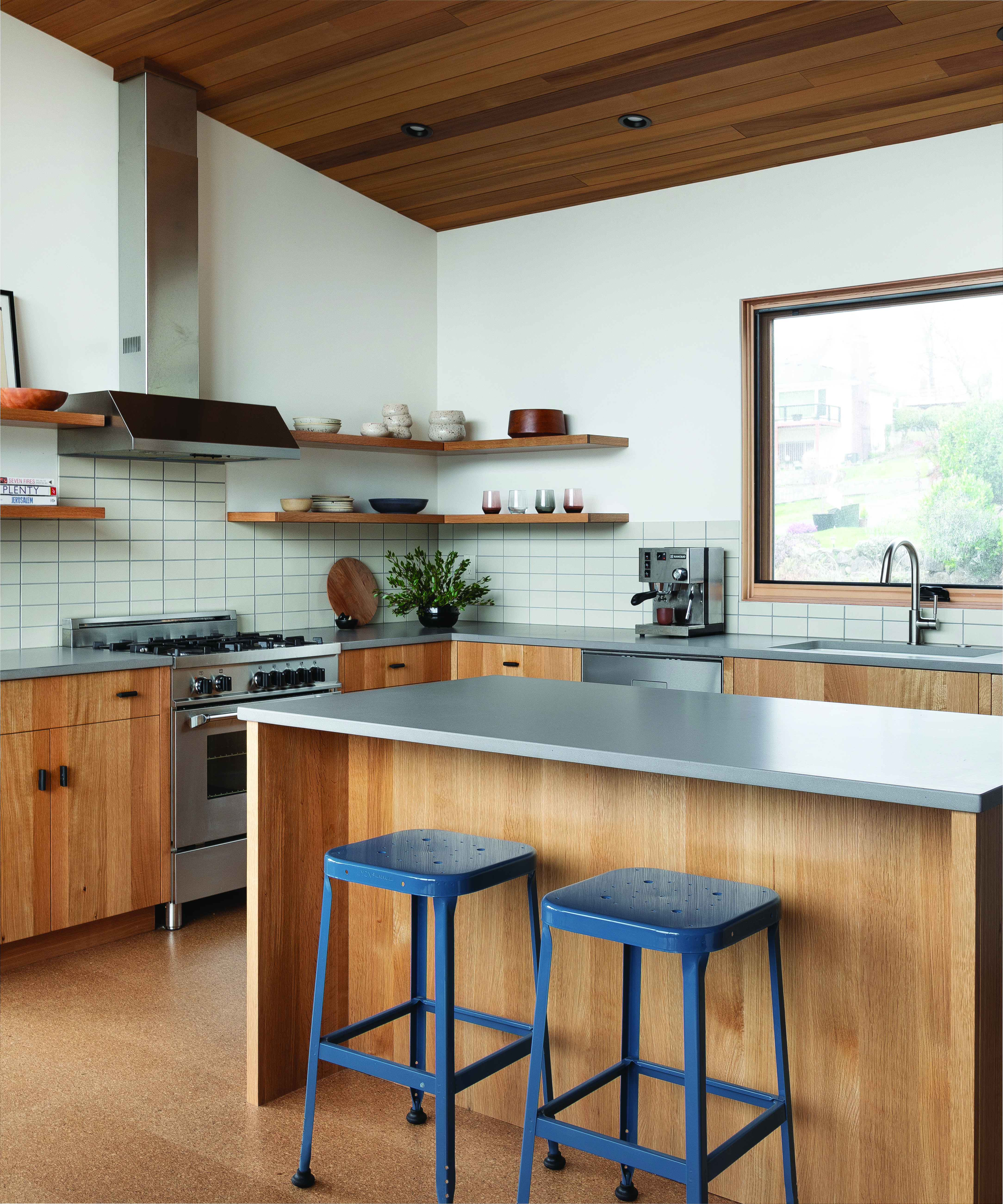 On the other side of the dual fireplace is the kitchen. The white oak cabinets and cork flooring pair with handmade white ceramic tile for a soothing palette that the Guggenheim studio created to reflect the natural Pacific Northwest atmosphere.
