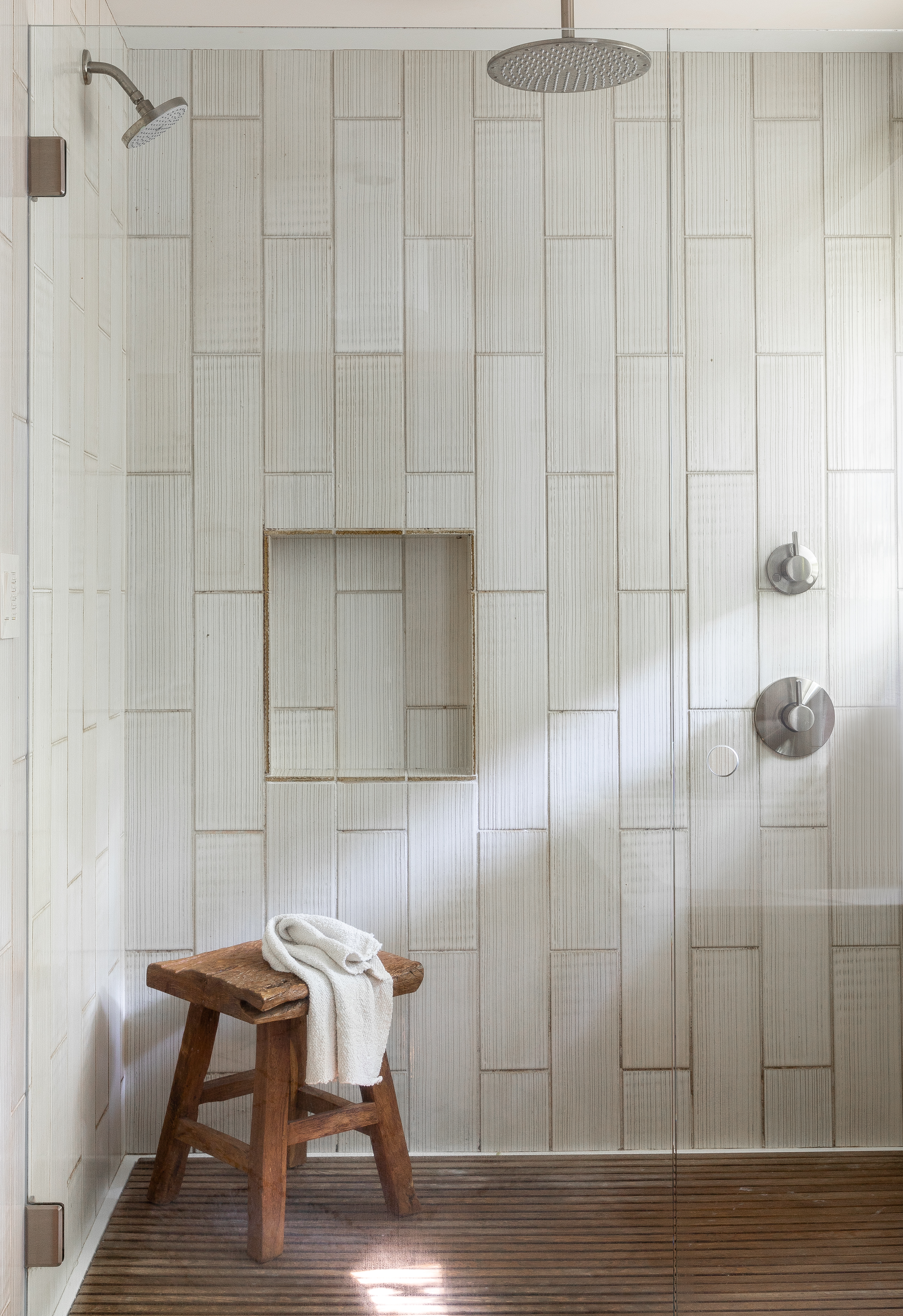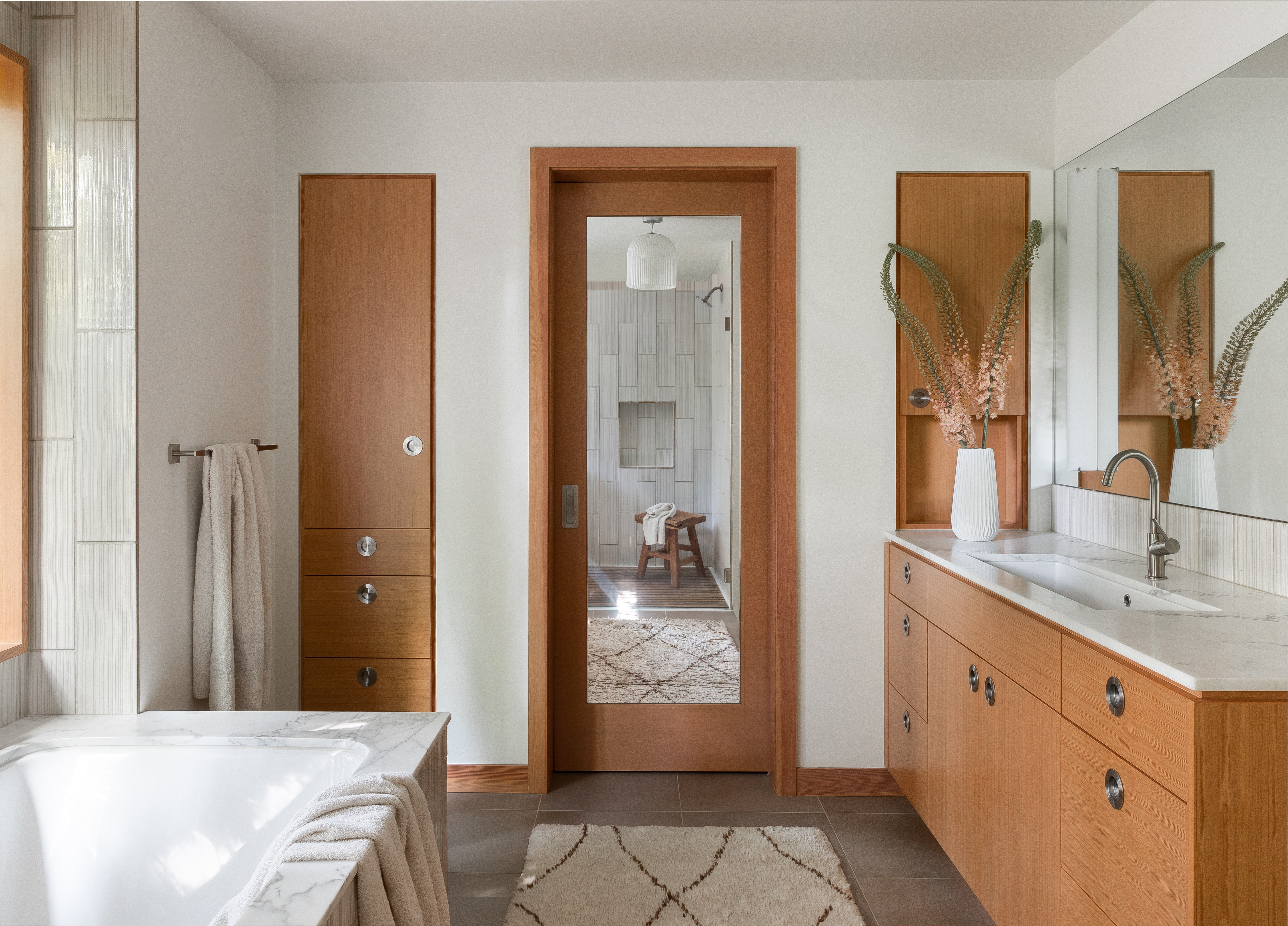 In the main suite, the bathroom is a thoughtful retreat that connects to the rest of the home. “A small bump-out allowed for the inclusion of a soaking tub under the picture window,” says Beers. “Consistency in materials reinforces this room’s relationship with the rest of the remodel.”