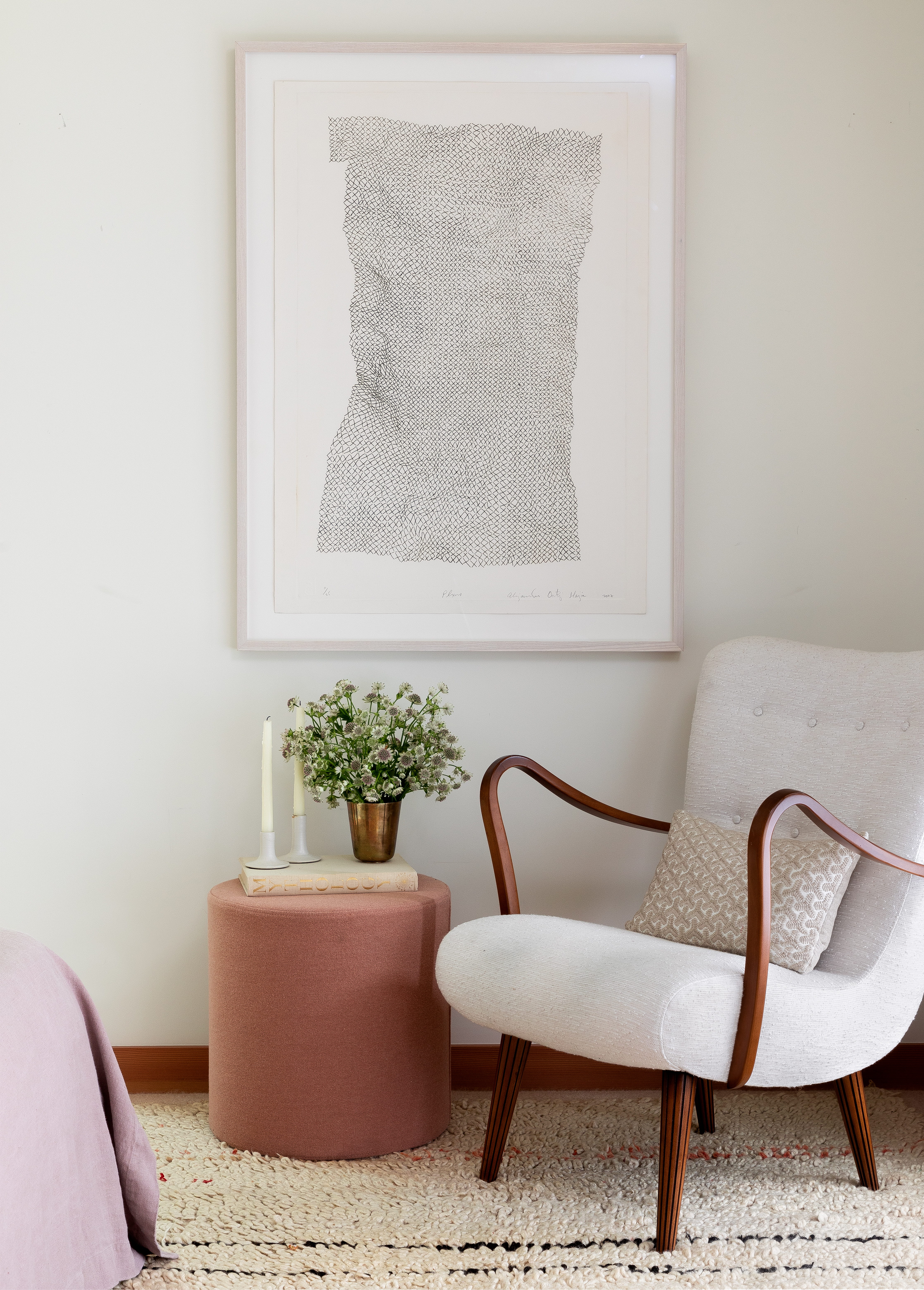 With such beautiful views in the bedroom, the colors in the bedroom were simple so not to distract. “Off-white, pale pink, and soft gray are punctuated with wood tones that recall the running trim,” says Beers