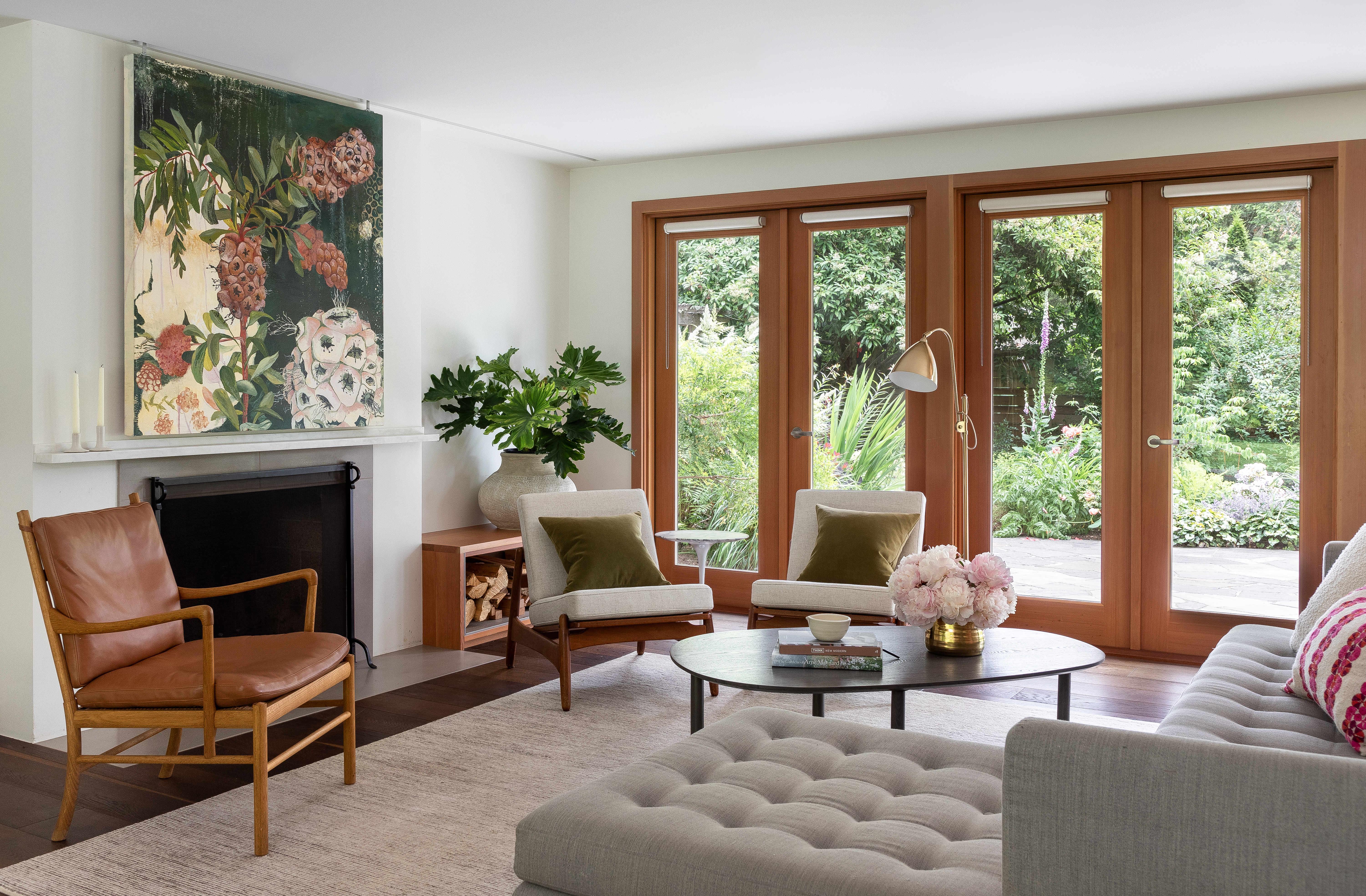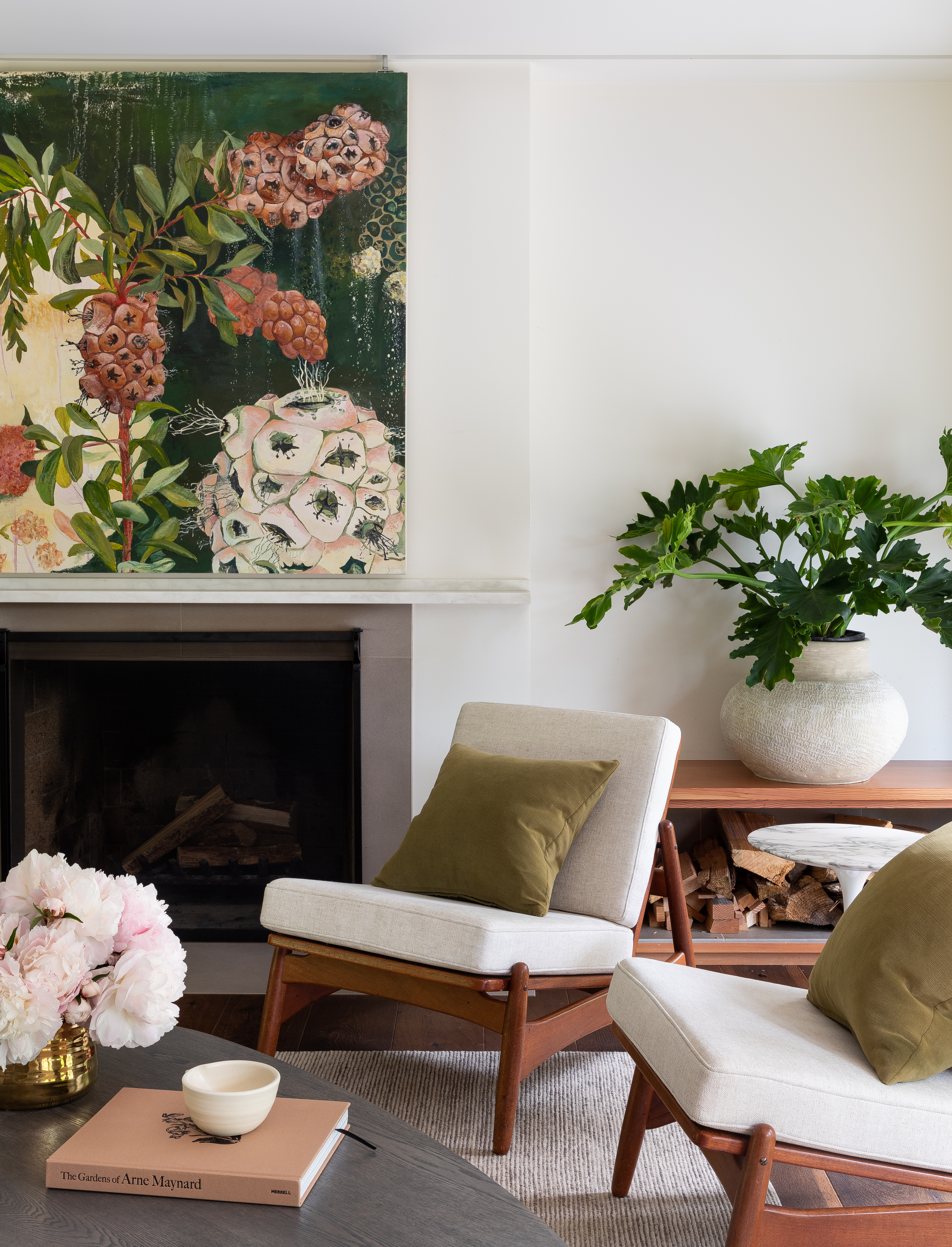 The great room’s color story was pulled from the room’s finishes and the art. Beers chose the saddle leather Ole Wascher chairs to complement the Douglas fir doors, the gray sofa was chosen to match the fireplace surround, and the green and pink pillows tie into the painting, which slides to reveal a hidden television.