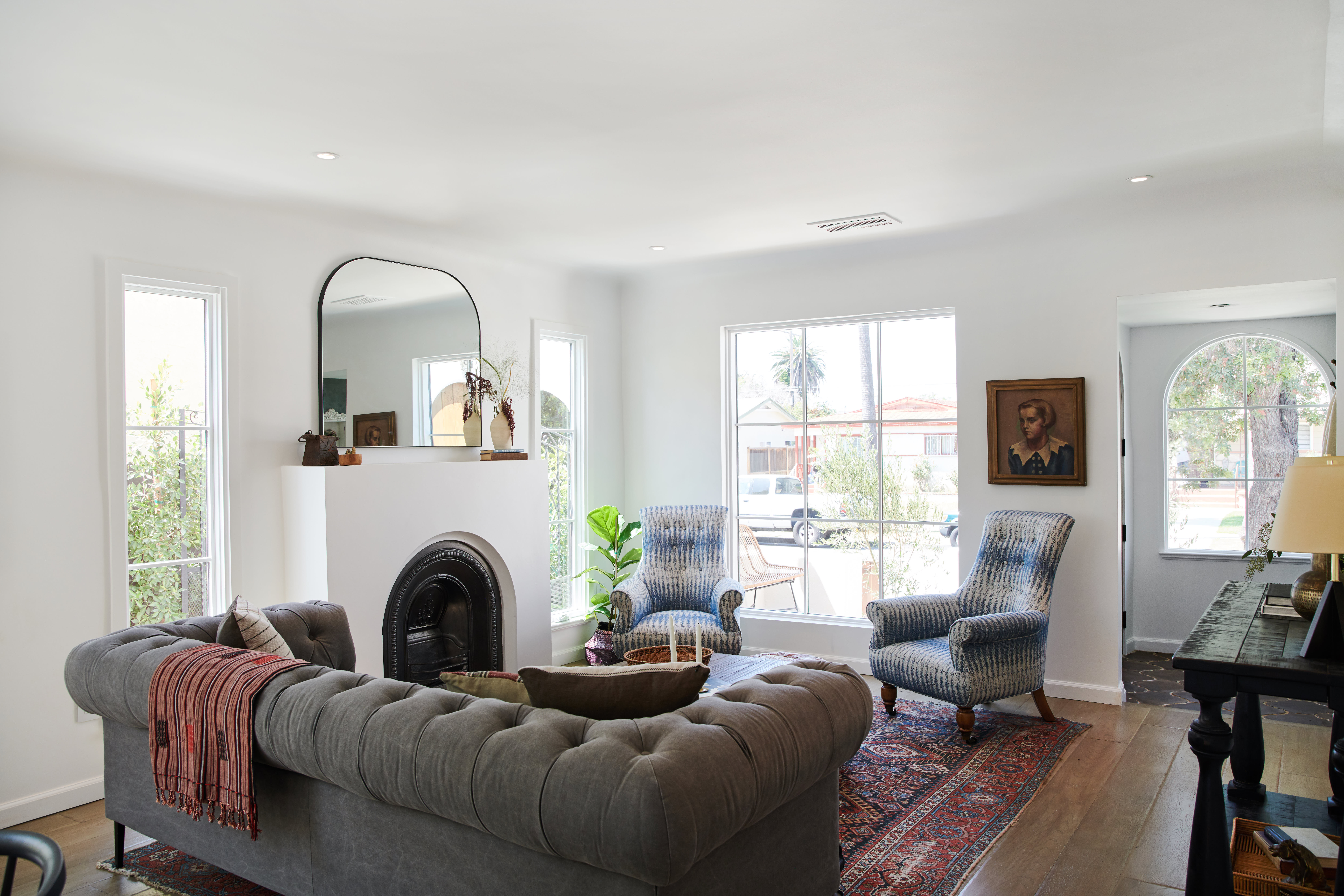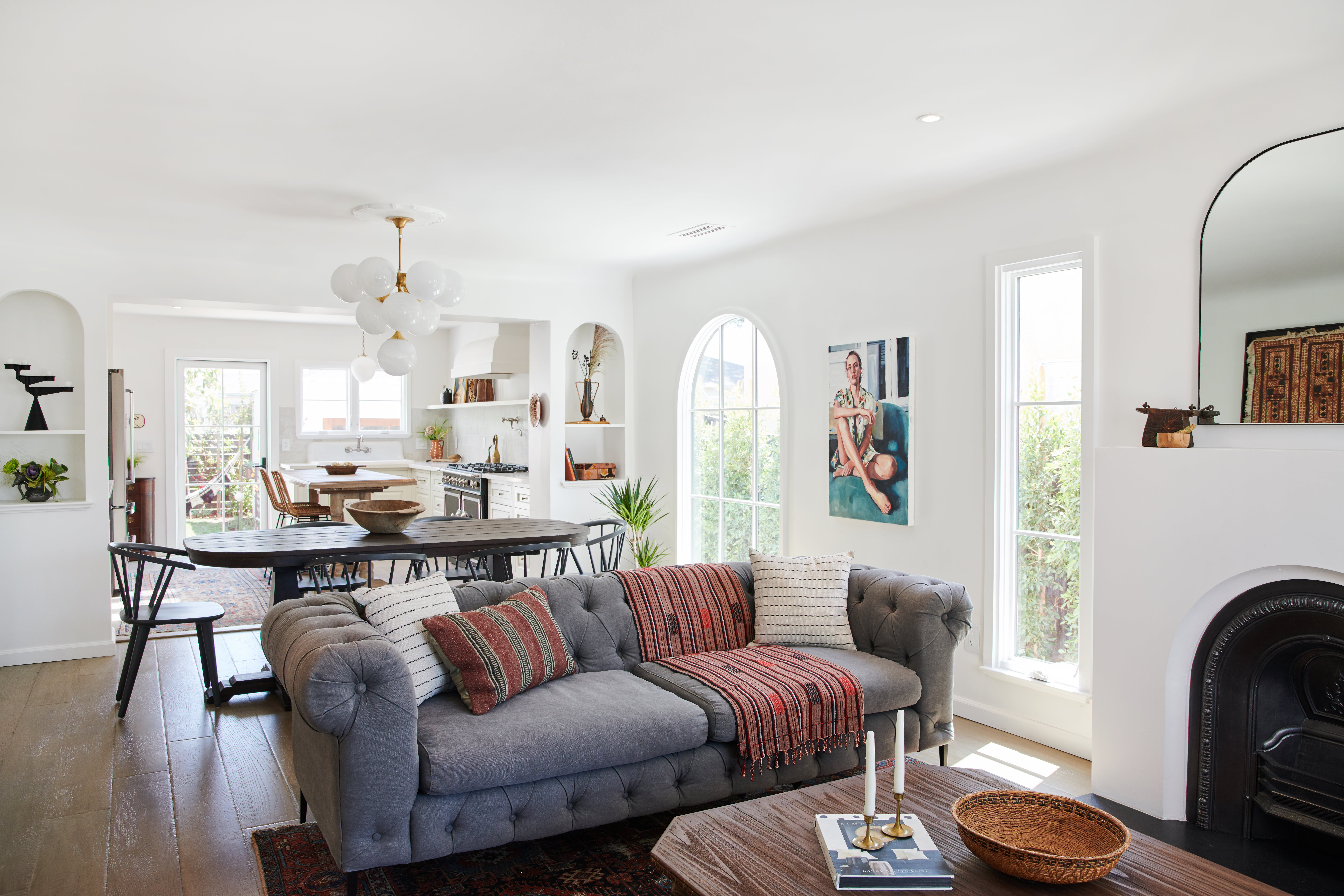 The living room got a kick of character with a vintage fireplace. “We imported a vintage 19th-century cast-iron fireplace from an old Victorian home in England just for this project,” said Wijaya. “A custom-built mantel nicely complements the fireplace and the big arches fill the space with light.”