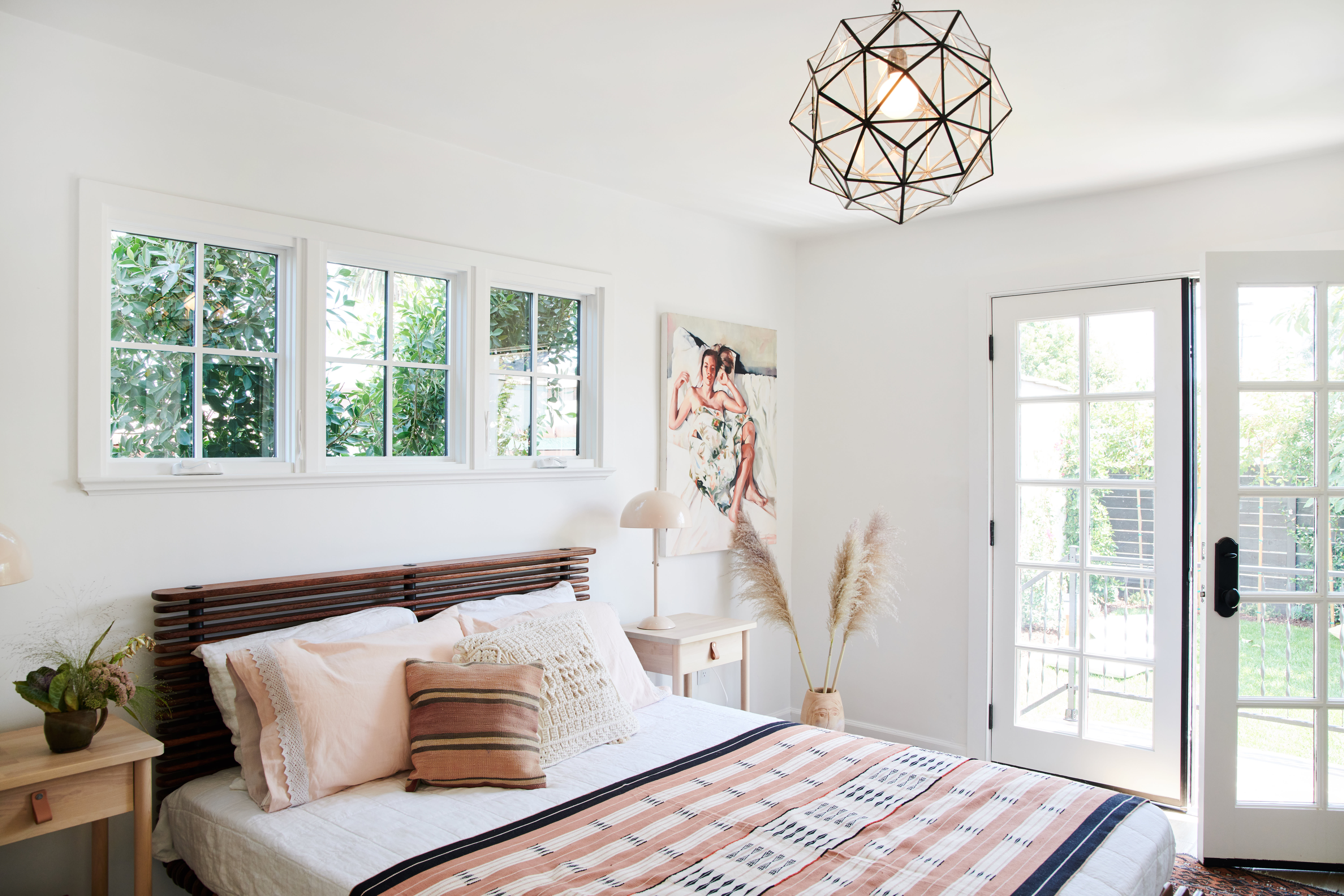 The master bedroom got plenty of upgrades too, from a La Viva granada rhombus chandelier with limewash paint to an indoor-outdoor bonus. “We built a new porch off this room to directly access the backyard,” said Wijaya.