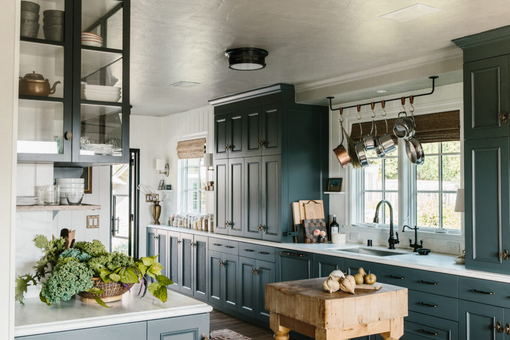 Maggio avoided space-hogging kitchen features, forgoing a massive island in favor of a vintage butcher block, to maximize the layout. Low, open shelves and plenty of custom cabinetry help, too.