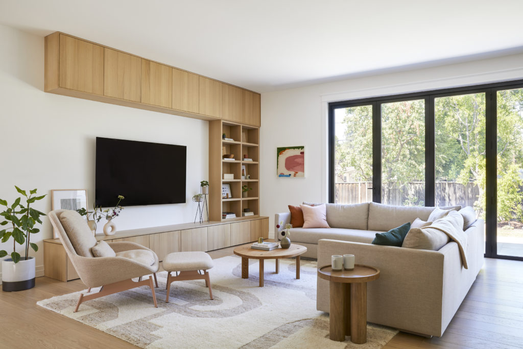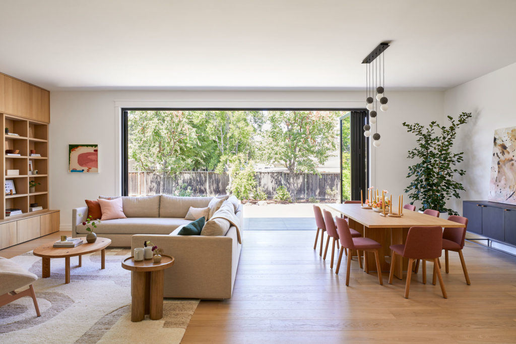 Much of the renovation was focused on the living room and transforming it to be a grand high-ceiling, open-concept indoor/outdoor space. The large fireplace was removed; the ceilings were raised by two feet; the footprint of the house was pushed out toward the backyard; and a large glass bifold door was installed. The kitchen and dining room were also opened to the living room as well—creating one big great room.