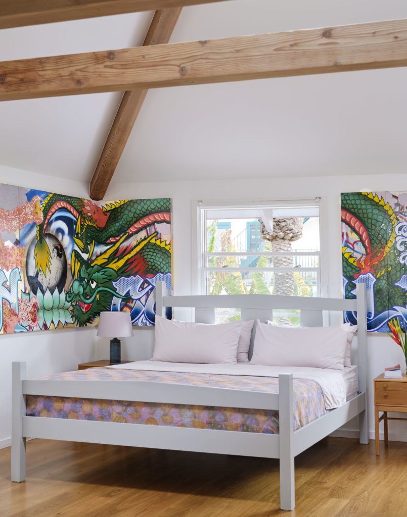 A Gajin Fujita modern graffiti mural takes center stage in the primary bedroom.