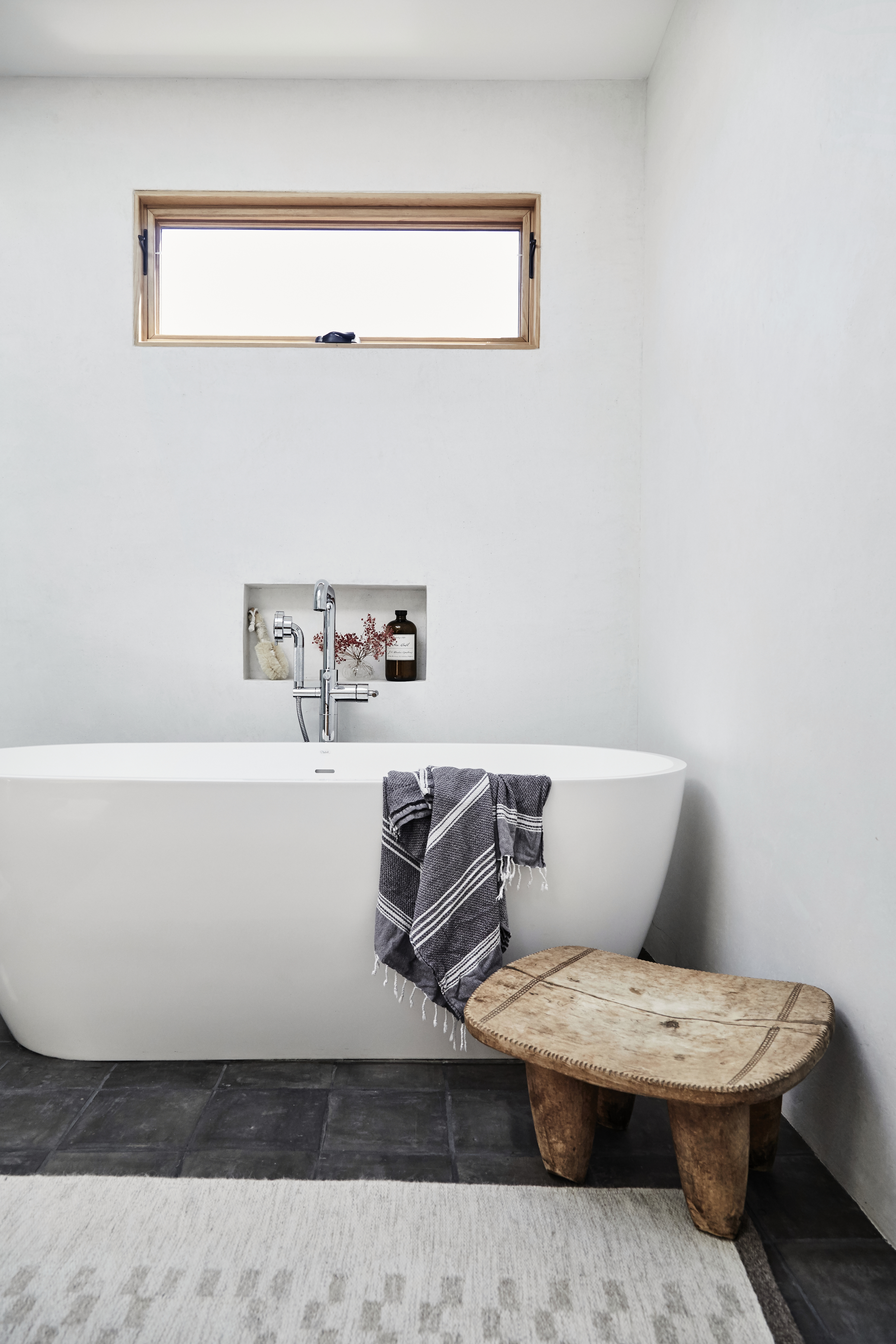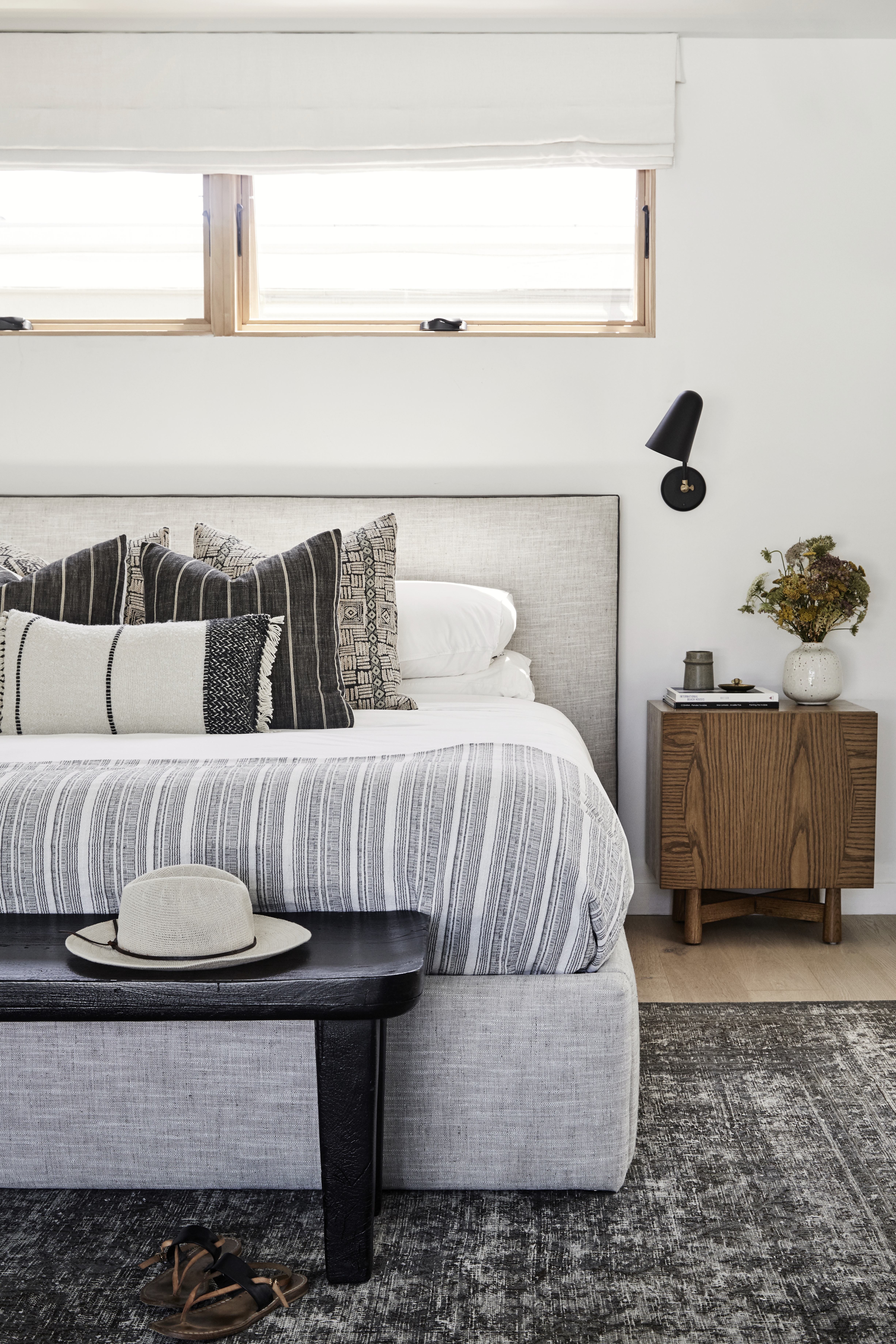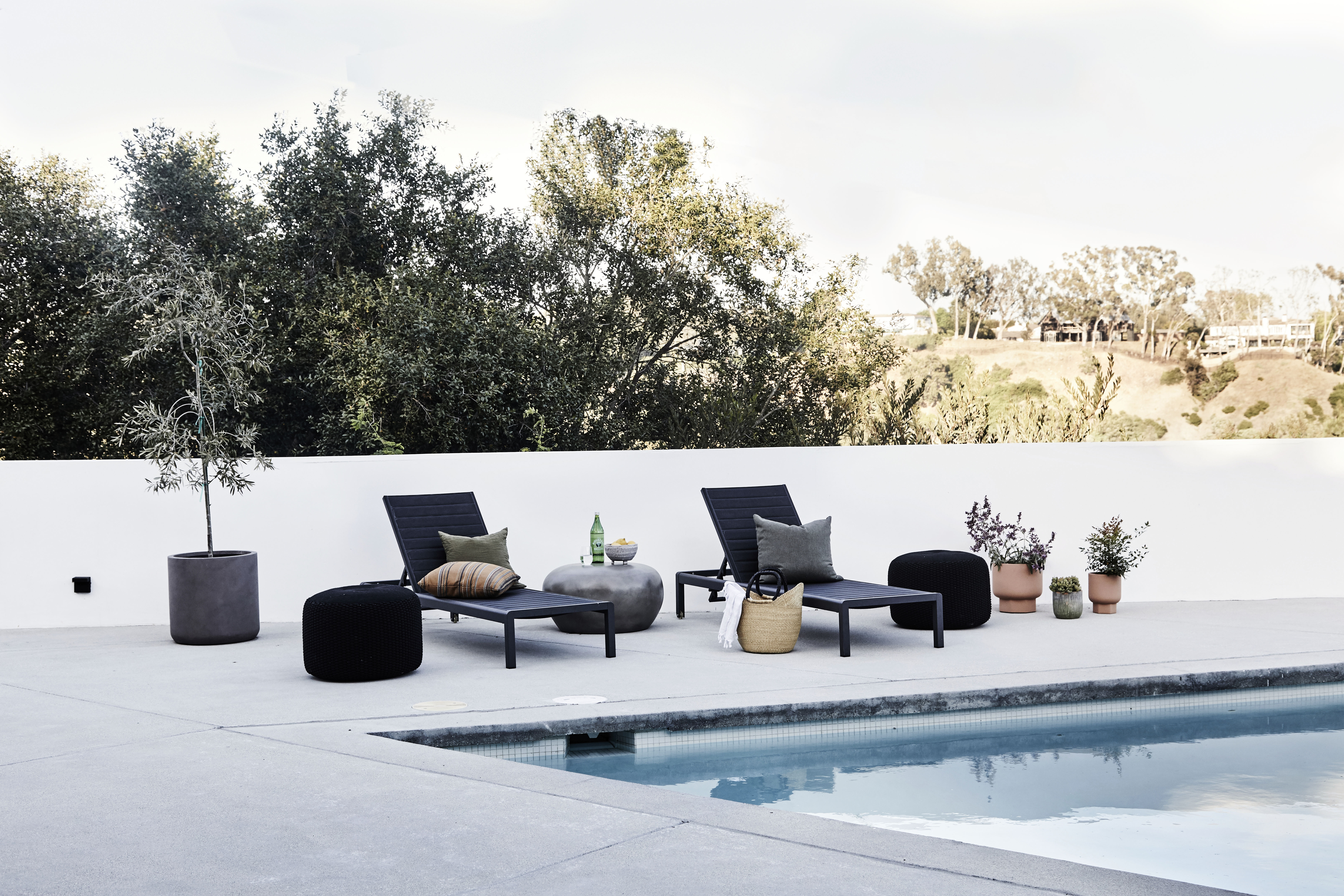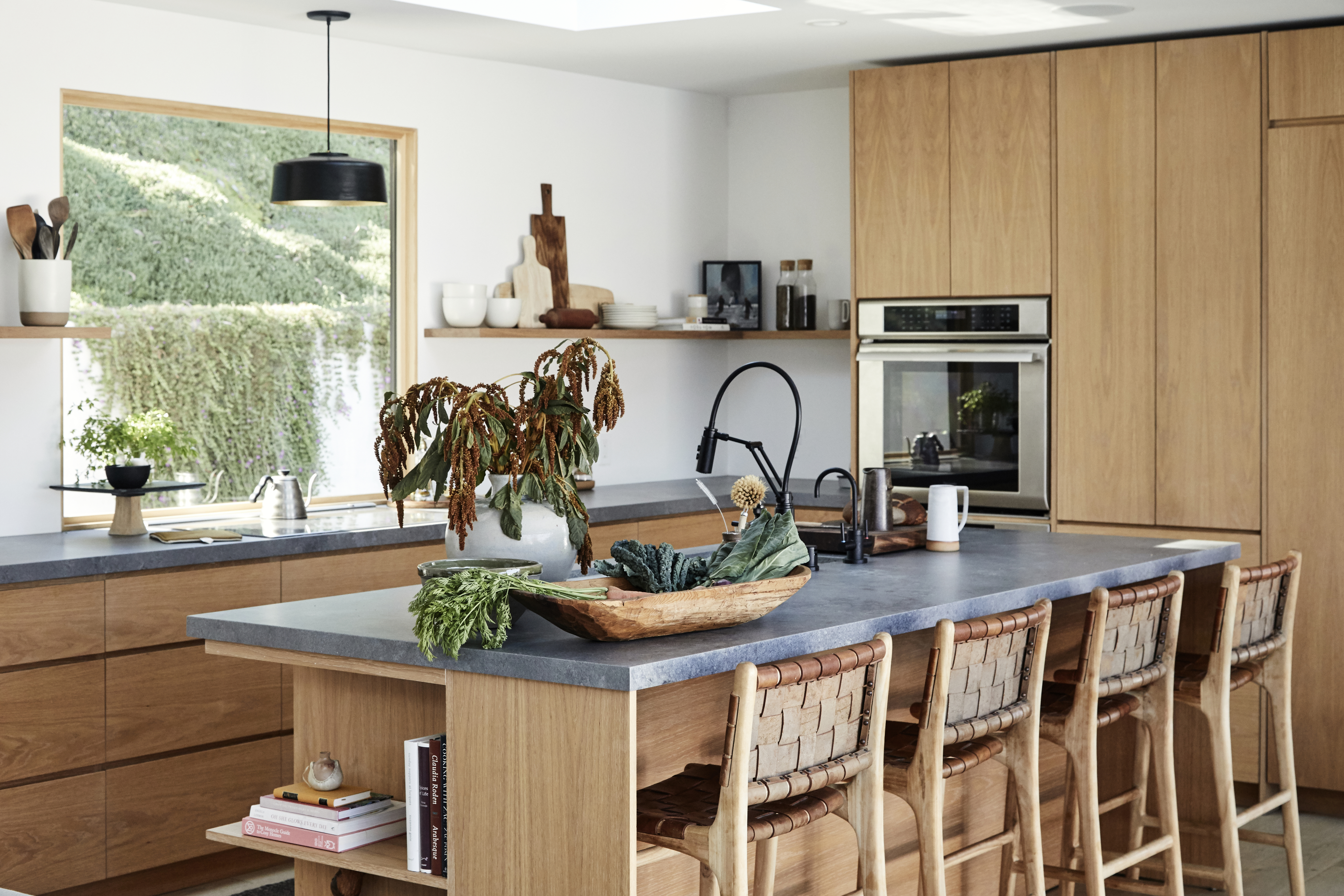What Waters could see in the home was that it had great potential for indoor-outdoor living, thanks to the complete privacy and surrounding canyon views, thanks to the house sitting on the end of a private street. “My goal was to expose the original character of the home. Design-wise, we set out to create a look I coined warm minimalism. In achieving this look, we needed to utilize muted tones—think rust hues, olive tones, and oak finishes. We incorporated textiles that mainly consisted of oatmeal linen fabrics, which softened the stark angles of the house. Because we incorporated a lot of black, we balanced the vibe with loads of wood,” she says.