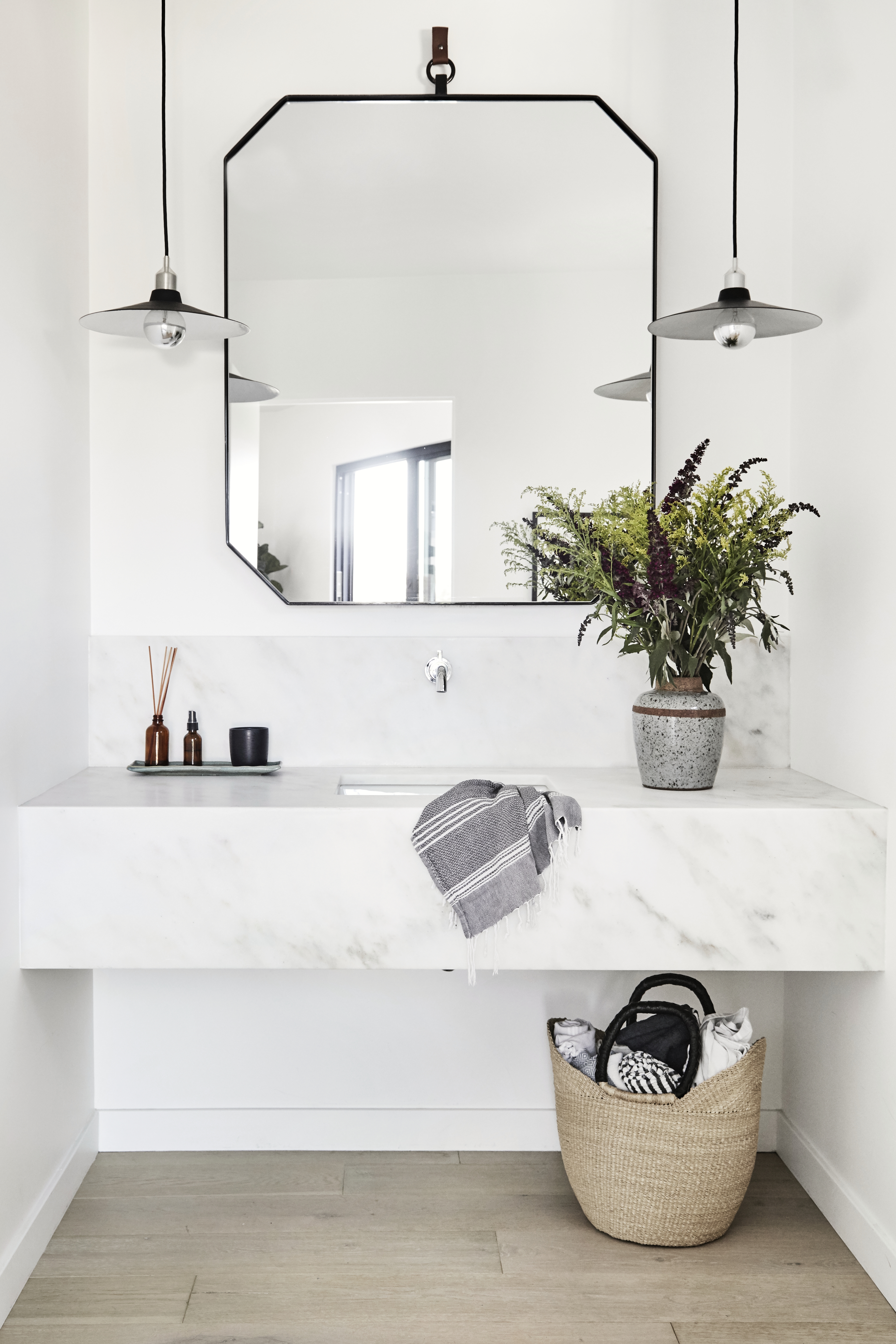 Upon opening the front door, you can see that fresh new look front and center. “We designed an oversized mirror for the space, which immediately sets the tone for the rest of the house,” says Waters.