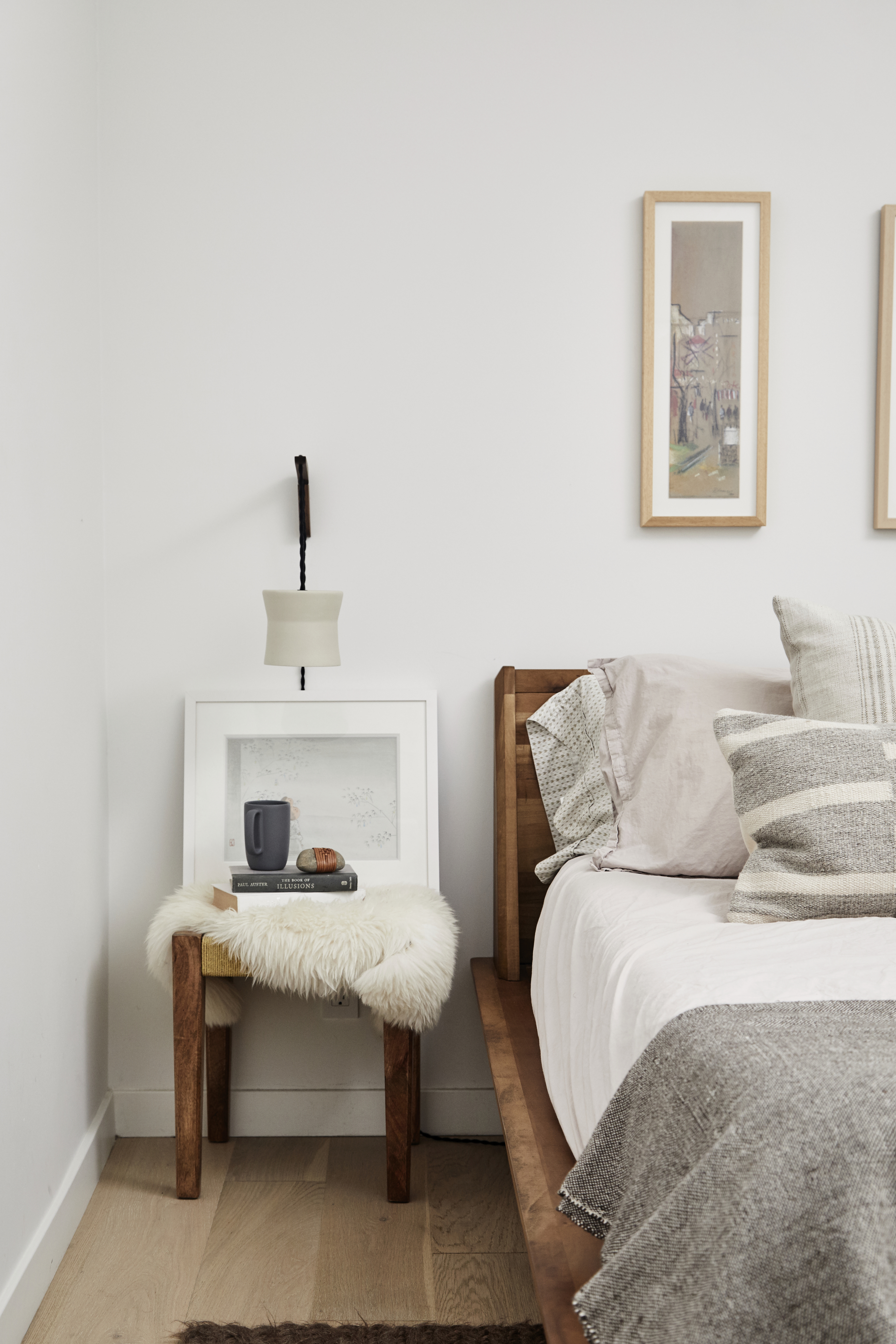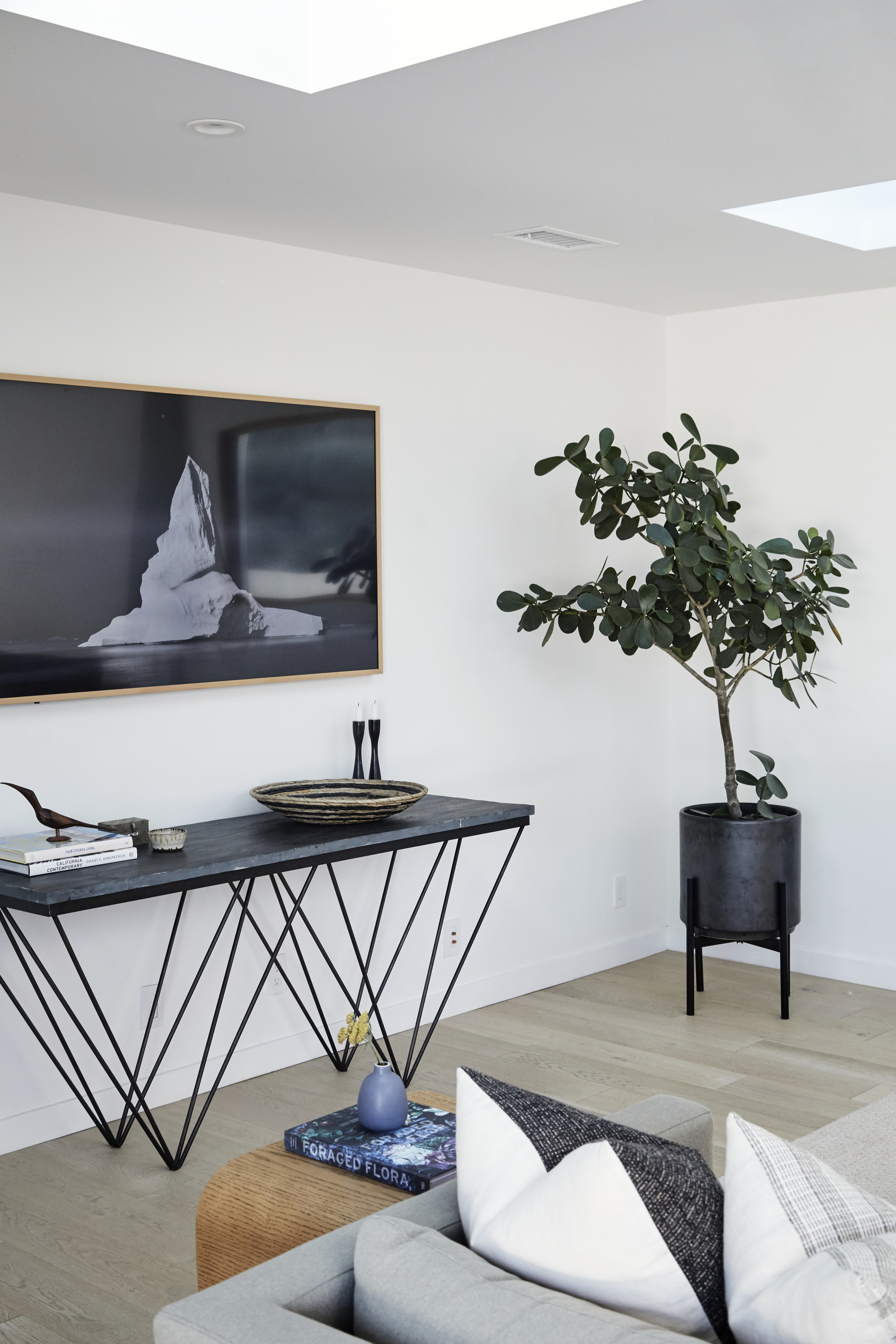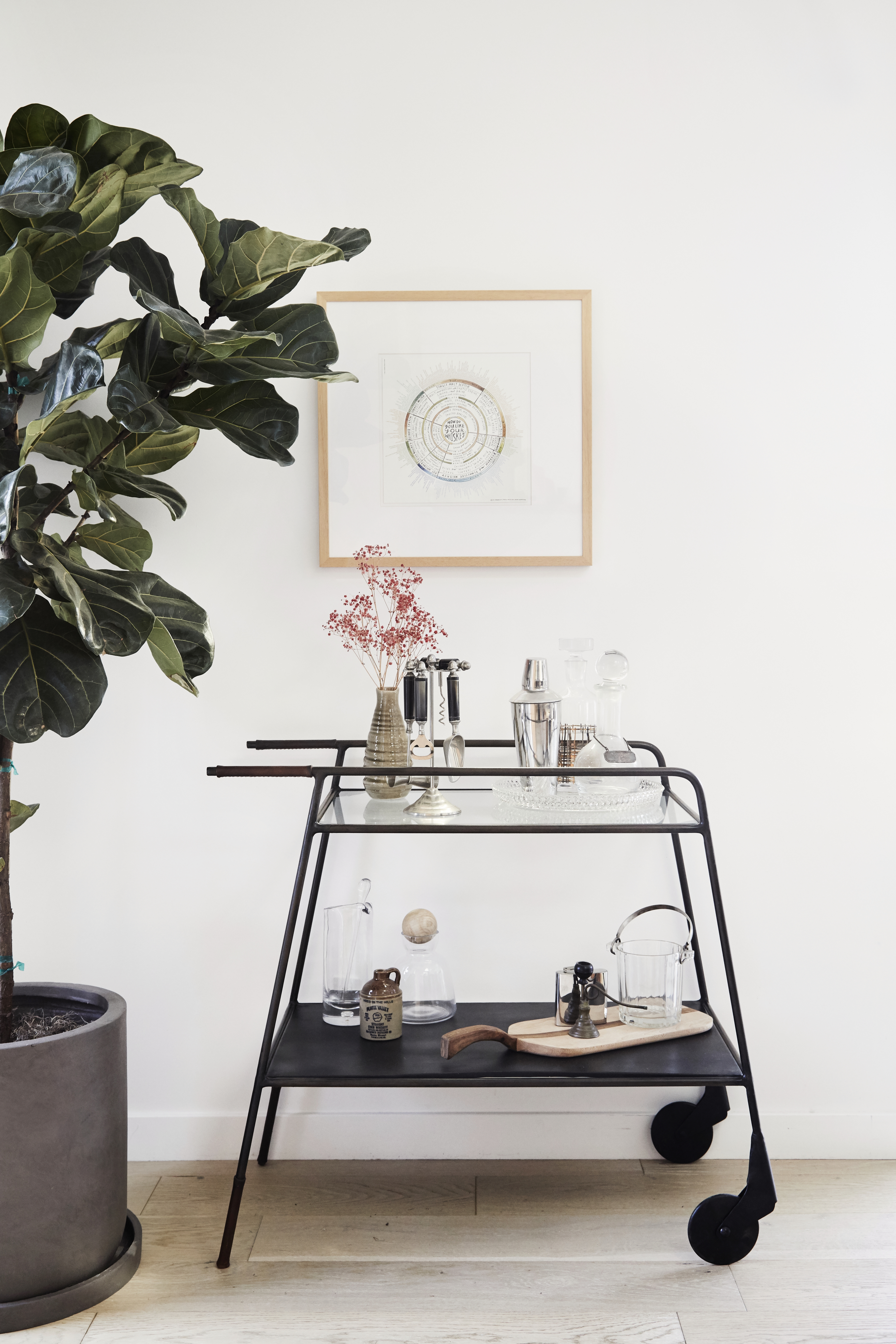 No living space is complete without a bar cart. This simple black cart, paired with the wooden frame above, rounds out the mood of the room.