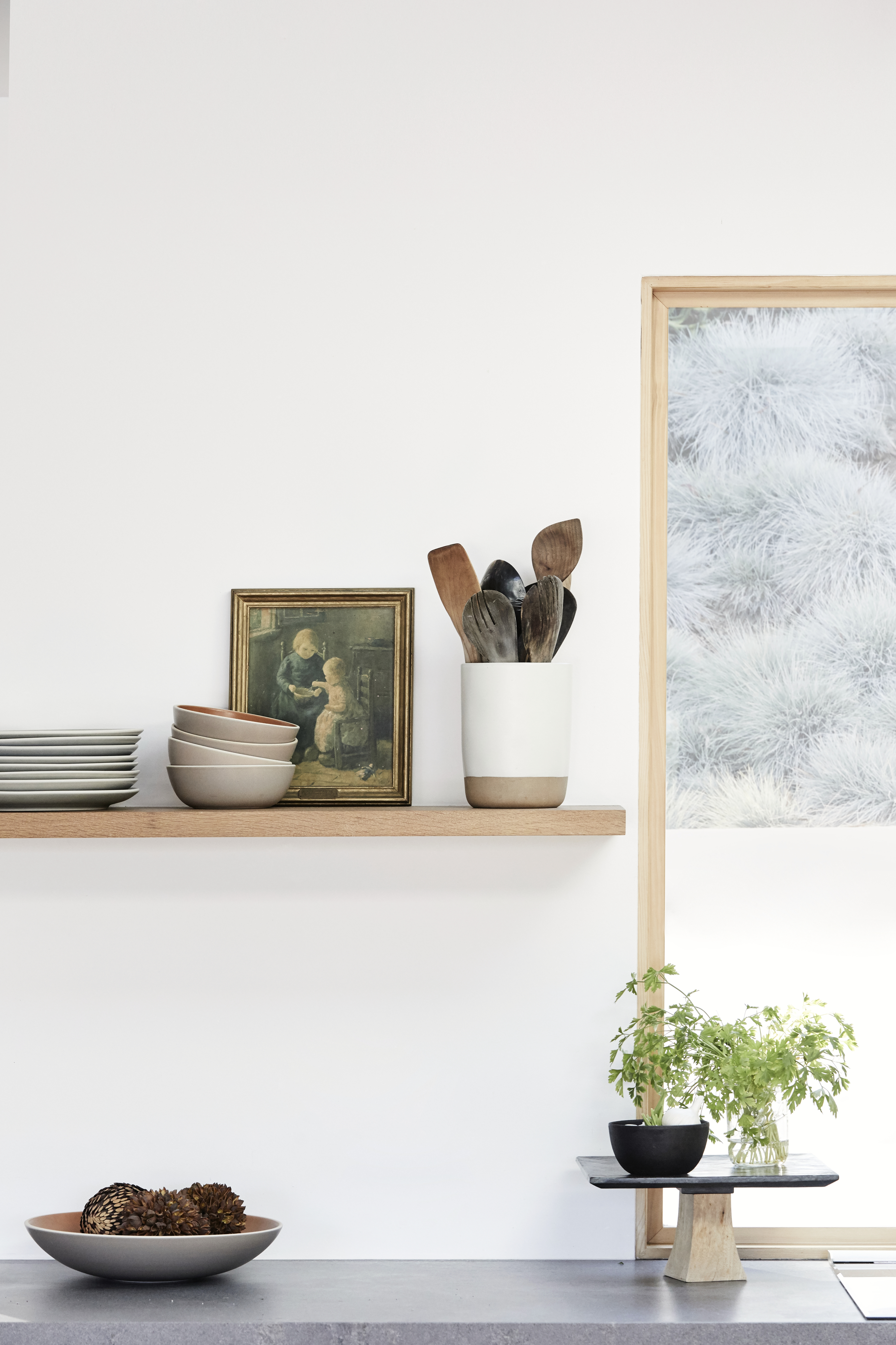The simple wooden open shelving matches Water’s warm minimalist ethos, complementing the darker countertops.