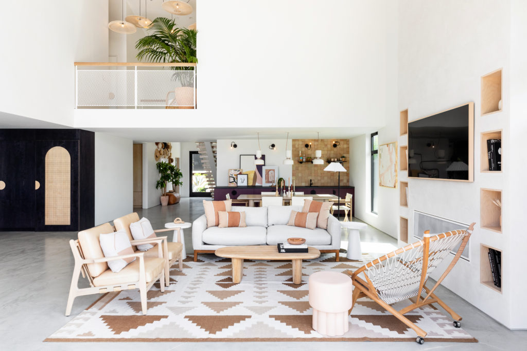 “At first, we thought we’d build an ADU in the backyard and outfit the main house as a smaller rental,” she says. Then, inspiration to transform the property into a single family home with a generous guest suite—and channel the desert oasis feel of traditional Moroccan homes—struck. The result is an open concept house with double-height ceilings and pocket doors that open to the back yard deck and pool area. Poured concrete floors, terrazzo bathrooms, and angular, boxy-feeling rooms give the house a kind of glamorous 1980s feel.
