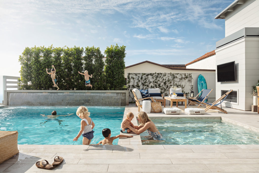 When the Hermosa Beach-based architecture and design studio Laney LA was presented with the challenge of fitting a pool, a hot tub, and a large deck for outdoor dining on a 5,400-square-foot lot in Manhattan Beach, they solved the problem (let’s call it a luxury problem) with the clever addition of a hydraulic cover.
