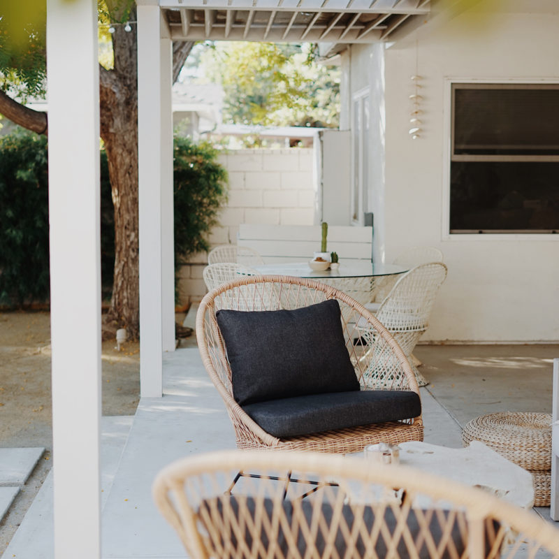 Try a classic wicker bistro set like this one ($300) or a trendy round set like this ($186) for light-colored but outdoor-ready furniture. Love the concrete look? Try these dining square stools ($192) and pair with light-colored cushions.